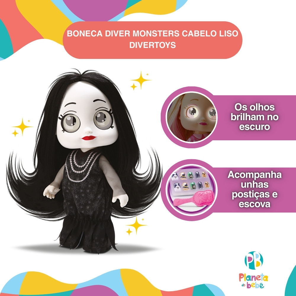 Boneca Diver Monster com Olhos Brilha no Escuro e Cabelo Liso - Divertoys Misteriosa, Estilosa e Brilhante! A Boneca Cabelo Longo é uma das personagens encantadoras e misteriosas da linha Diver Monster, desenvolvida para levar as crianças a um universo mágico onde a fantasia ganha vida, principalmente quando as luzes se apagam! Com um visual marcante e cheio de personalidade, ela encanta com seus olhos grandes e expressivos que brilham no escuro, criando um efeito mágico surpreendente que transforma qualquer brincadeira em uma aventura iluminada pela imaginação. Seu estilo diferenciado conta com cabelos longos e lisos na cor preta, perfeitos para penteados criativos e cheios de estilo. Já a sua pele super branca dá aquele toque "monstrinho fashion", reforçando seu visual misterioso e encantador. O vestidinho preto e as botinhas estilosas completam o look, deixando-a pronta para arrasar em qualquer aventura. Além disso, ela ainda acompanha uma escova especial para manter os cabelos sempre arrumados e, unhas postiças para que as meninas também possam se transformar junto com ela. Essa boneca é perfeita para estimular a imaginação das meninas, permitindo que elas criem histórias e aventuras misteriosas, tornando a brincadeira ainda mais divertida! Principais Características: - Idade Recomendada: A Partir de 3 anos - Modelo: Cabelo Liso - Cabelo Preto Longo Liso - Olhos Grandes Expressivos - Olhos que Brilham no Escuro - Vestido e Botinhas Estilosas - Acompanha Escova e Unha postiça - Aventura Noturna com Mistério e Diversão - Material Leve e Resistente Especificações Técnicas: - Conteúdo da Embalagem: 1 Boneca Diver Monster Cabelo Longo - Divertoys - Composição/Material: Plástico - Peso do Produto: 0,600kgs - Garantia: 30 dias (Contra Defeitos de Fabricação Pelo Fabricante) - Código do Fabricante: 8361 - EAN: 7898639383617 - Marca: Divertoys Imagens Meramente Ilustrativas. As cores e estampas podem variar de acordo com o lote do fabricante.