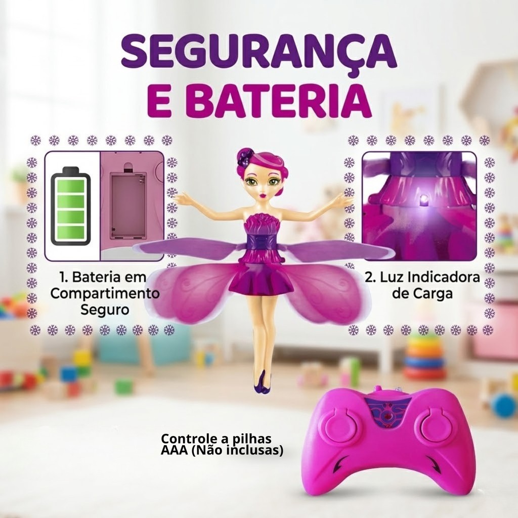 Boneca Fada Voadora Infantil Sensor Controle Remoto Movimento Sensor Luz Usb Recarregável Fada Das Flores Meninas Kizumba A Boneca Fada Voadora Fada das Flores é um brinquedo mágico e interativo que encanta crianças com sua capacidade de voar através de sensor de movimento. Basta posicionar a mão abaixo da boneca para controlar sua altura, criando uma experiência divertida e surpreendente. Com design delicado e colorido, possui luzes que deixam o voo ainda mais encantador. Fabricada em material leve e resistente, é ideal para uso infantil e perfeita para estimular a imaginação, coordenação motora e criatividade. Recarregável via USB, oferece praticidade e economia, sendo uma excelente opção de presente para crianças que adoram fantasia e brincadeiras interativas. Especificações Técnicas: • Tipo: Boneca voadora com sensor • Modelo: Fada das Flores • Material: Plástico resistente • Alimentação: Bateria recarregável via USB • Controle: Sensor de movimento + controle remoto • Funções: Voo, luzes LED • Idade recomendada: A partir de 3 anos • Acessórios: Asas/pétalas removíveis Dimensões: • Altura: 18 cm • Largura: 13 cm FAQ (Perguntas Frequentes): 1. Como a fada voa? Ela possui sensor de movimento que detecta a mão e controla a altura do voo. 2. Precisa de pilhas? A boneca é recarregável via USB, porém o controle usa pilhas AAA (não inclusas). 3. É segura para crianças? Sim, é leve e feita com material resistente, indicada para uso infantil. 4. Pode usar dentro de casa? Sim, o ideal é usar em ambientes internos ou locais sem vento. Conteúdo da Embalagem: • 01 Boneca Fada Voadora • 02 Pétalas/Asas • 01 Cabo USB para Recarga (Não contém adaptador) • 01 Controle Remoto Importante: Valor Unitário Imagens Meramente Ilustrativas Não nos responsabilizamos pelo mau uso do produto