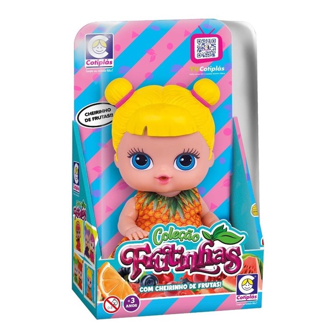 Boneca linda e com cheirinho de fruta. As Frutinhas da Cotiplás voltaram ainda mais lindas! Com expressões marcantes e cabelos com cores vivas, as crianças vão se apaixonar por esses bebês! É super fofa, delicada, gostosa de abraçar e apertar, e compõe um delicioso cheirinho da frutinha que representa, neste caso, um delicioso cheirinho de morango! Com o alto padrão de qualidade característico das bonecas Cotiplás. Estimula a interação entre pais e filhos, coordenação motora, criatividade e imaginação da criança! Aproveite! Bonequinhas fofinhas com cheirinho de frutas. Especificações. Conteúdo da Embalagem: 1 boneca de aproximadamente 18 cm.