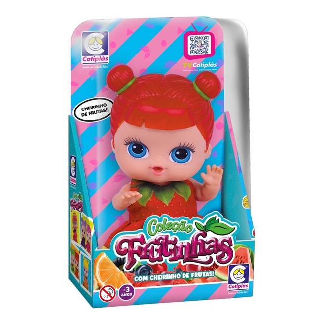 BONECA COLECAO FRUTINHAS COTIPLAS As Frutinhas da Cotiplás voltaram ainda mais lindas! Com expressões marcantes e cabelos com cores vivas as crianças vão se apaixonar por esses bebes! E super fofa, delicada, gostosa de abraçar e apertar, e compõe um delicioso cheirinho da frutinha que representa. Com o alto padrão de qualidade característico das bonecas Cotiplás. Estimula a interação entre pais e filhos, coordenação motora, criatividade e imaginação da criança. ESPECIFICACOES: Recomendado para crianças a partir de 3 anos Altura aproximada da boneca: 18 cm Com cheirinho de fruta Marca: Cotiplás Certificado de Segurança: INMETRO. ATENCAO: Todas imagens e informações são de responsabilidade do fabricante. Os detalhes e modelos podem variar de acordo com o lote de fabricação.
