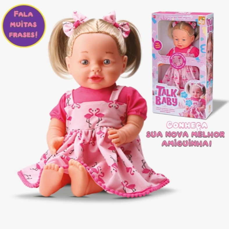 Boneca Grande 50cm Talk Baby Loira Fala Frases - Envio Imediato - Talk Baby fala frases, basta apertar sua barriguinha para ouvir frases encantadoras. “Você é Linda”, “Vamos Brincar Juntas”, e muito mais frases que deixarão suas brincadeiras ainda mais legais! Conheça sua melhor amiguinha, feita com muito amor e detalhes incríveis, ela é perfeita para criar memórias mágicas. Especificações: - Idade recomendada: a partir 2 anos. - Altura da boneca: 50cm altura. - Material composição: Cabeça braços e pernas em vinil, corpo enchimento. - Som: Sim. - Conteúdo: 01 Boneca. - Certificado de Segurança: INMETRO.004 414 /02020. Agradecemos sua confiança! Qualquer dúvida, estamos a disposição!
