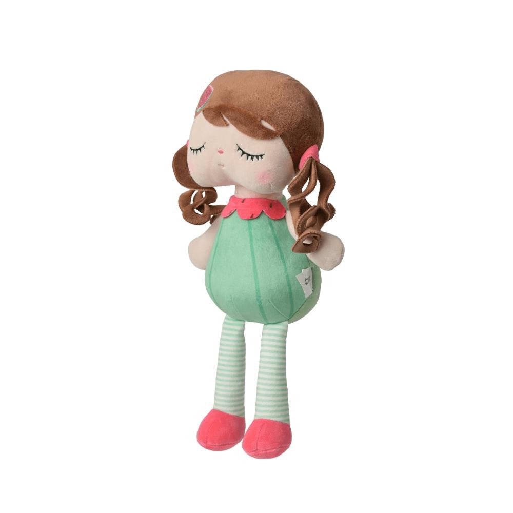 A Angela Frutas Melancia da Metoo é pura fofura e frescor! Com seu visual inspirado na fruta mais refrescante do verão, ela conquista corações com seu corpinho temático, toque aveludado e olhos fechadinhos, que transmitem calma e ternura. Ideal para acompanhar os pequenos desde o nascimento, essa bonequinha é perfeita para decorar, colecionar, presentear ou levar para todos os cantos nas brincadeiras mais doces. Feita com pelúcia super macia e materiais seguros, a Angela Melancia é uma peça encantadora que traz cor, carinho e diversão para o universo infantil. ATENÇÃO: Produto original Metoo, com etiqueta em português, selo antifraude e certificação do INMETRO. ESPECIFICAÇÕES: Recomendado para todas as idades a partir de 0 meses; Toque aveludado e olhos fechados, ideais para acalmar os bebês; Produto colecionável e decorativo. COMPOSIÇÃO: 100% poliéster; Enchimento: 100% fibra de poliéster. MEDIDAS APROXIMADAS: Da cabeça ao corpo: 33 cm Da cabeça aos pés: 36 cm LIMPEZA E MANUTENÇÃO: Lavar preferencialmente à mão; Caso opte pela máquina, usar rotação leve e temperatura máxima de 30º; Não limpar a seco; Não usar secadora. Sobre a marca: A Metoo, criada em 2004, é uma marca internacional que combina design encantador com materiais de alta qualidade para criar bonecas e pelúcias que despertam afeto e imaginação. No Brasil, oferece produtos exclusivos que prezam pela segurança, conforto e estilo dos pequenos. As bonecas Angela são verdadeiros itens colecionáveis, ideais desde o nascimento, perfeitas para decorar e presentear com amor. Explore a coleção completa e apaixone-se por cada detalhe!