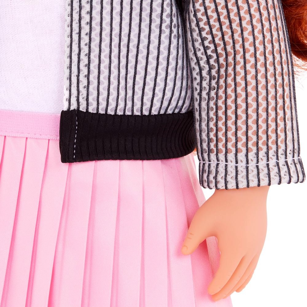 Conheça Jacinta, a encantadora boneca Our Generation de 46 cm que vai despertar a imaginação e o carinho das crianças! Com corpo macio e abraçável, Jacinta possui olhos castanhos realistas que abrem e fecham, além de um cabelo ondulado castanho-avermelhado perfeito para escovar e criar diferentes penteados, como rabos de cavalo, tranças e coques. Ela chega vestida com uma jaqueta moderna, blusa casual, saia plissada rosa vibrante, tiara com laço, calcinha e sapatos, ideal para brincadeiras de vestir e contar histórias. Suas articulações no pescoço, braços e pernas facilitam a troca de roupas e ampliam a diversão, permitindo que as crianças explorem a criatividade com as roupas e acessórios Our Generation.