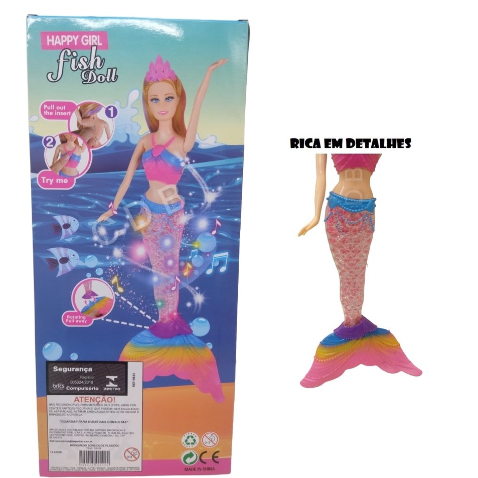 FISH DOLL KUNYUN SEREIA COM MUSICA E LUZ, ACOMPANHA ACESSÓRIOS Boneca sereia do Arco-íris Tamanho 35 centímetros articulada Luz de Led na cauda Toca música basta apertar o botão no colar da boneca As Crianças ficarão apaixonadas por ela! Conteúdo da Embalagem: - 1 Sereia - 1 pente - 1 espelho
