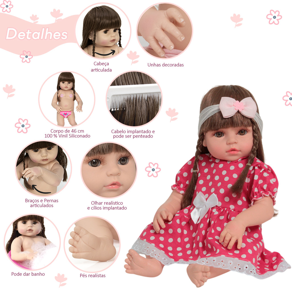 Boneca Reborn Bebê Valentina 46cm Corpo de Vinil Pode Banho