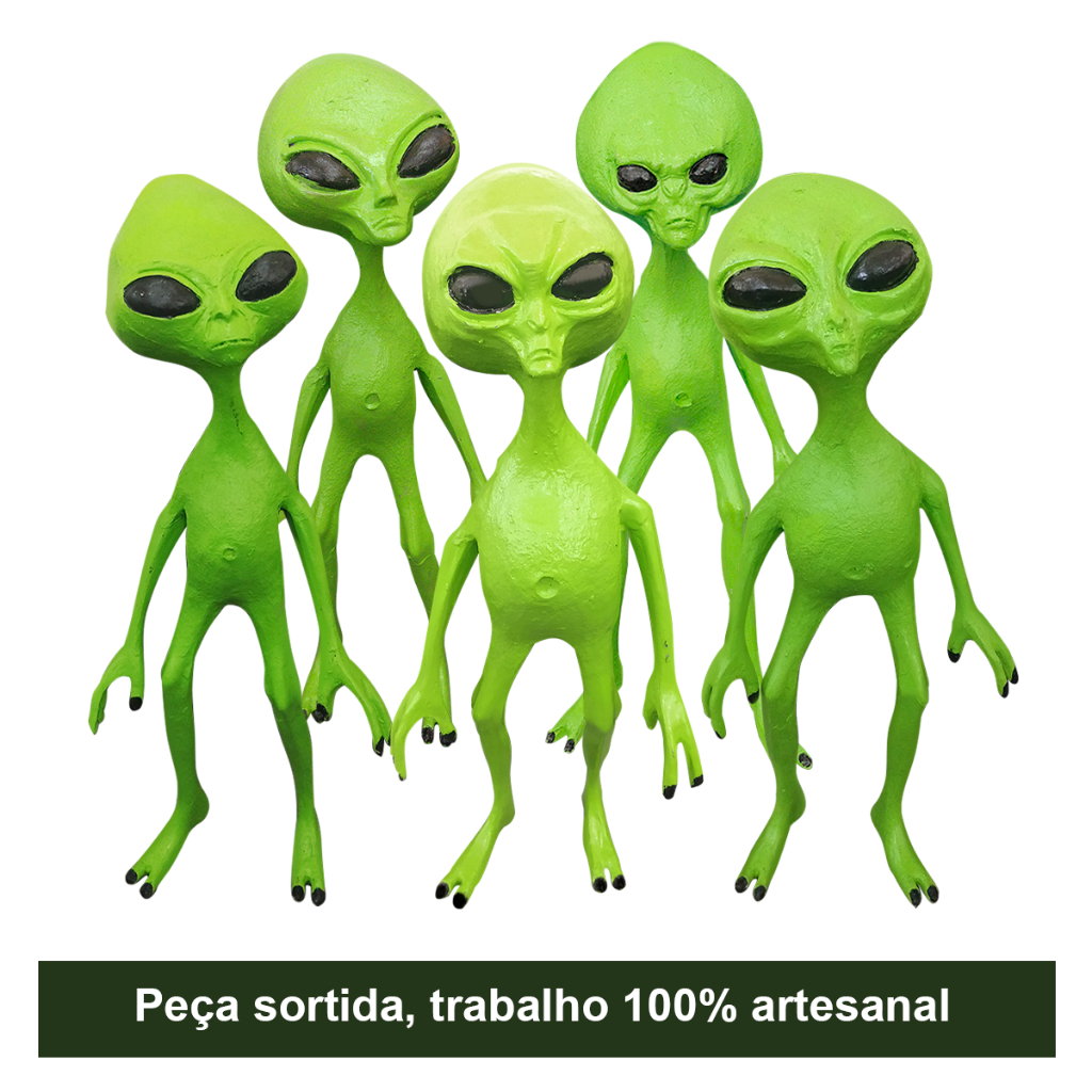 Boneco Alienígena Et Extraterrestre Verde Decoração para acompanhar o Amigo Caminhoneiro na sua Viagem - Boneco para uso em decoração - Peça sortida - Tamanho aproximado: 75cm - Peso aproximado: 1,5Kg - Trabalho 100% artesanal - Fabricado em Fibra de Vidro e Resina - Enviado na cor Verde - Obs: "Esse produto não é articulado" - Em caso de dúvidas use o campo de Perguntas. Obs.: Peças não genuínas da montadora.