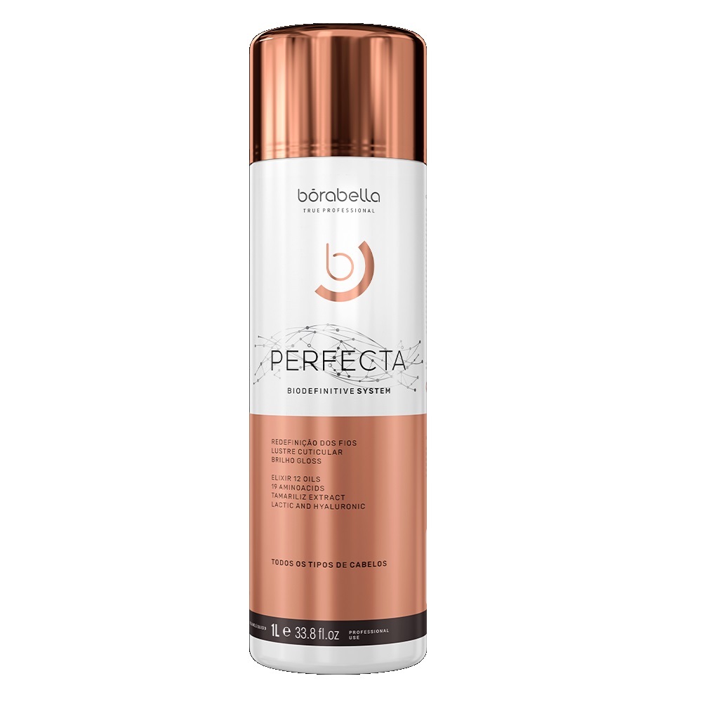 Borabella Perfecta Progressiva BioDefinitive System 12 Oils - 1 Litro A Perfecta BioDefinitive tem alto fator hidratante proporciona um cabelo totalmente alinhado, disciplinado, selado, macio, com balanço natural e um brilho gloss de salão. - Orgânica, livre de formol e conservantes doadores ou derivados; - Mais nutrição: conta com um blend extenso de 12 óleos nutritivos leves, que penetram profundamente na fibra capilar, amaciando e nutrindo sem pesar; - Mais hidratação: ativos hidratantes umectantes, como o Ácido Hialurônico, foram aumentados. A junção de maior nutrição com maior poder de hidratação resulta em um maior tratamento dos fios ressecados e quimicamente processados, dando melhor aspecto às pontas; - Sem pigmento matizador: o creme é claro, não possui matização, permitindo aplicar em cabelos muito claros com tons acima de 9; - Apenas um passo: mais praticidade e rapidez na aplicação. Facilidade no processo, secagem rápida, deslizamento fácil e sem forçar o braço. - Resultado 100% profissional, antifrizz, duradouro e garantido, livre de retoques ou retornos de clientes. Sua fórmula inteligente foi desenvolvida através da união entre matérias-primas importadas de origem europeia e norte-americana, ativos emolientes nobres, proteínas e um blend exclusivo formado por 19 aminoácidos + ácidos orgânicos, como o Ácido Lático, Ácido Hialurônico, Sericina, Queratina, Extrato de Tamarindo e um elixir de 12 óleos leves e nobres. Todos os ativos garantem um tratamento antifrizz profissional de longa durabilidade, completamente livre de ardência ou incômodos no processo de aplicação. Elixir 12 OILS: é uma extraordinária associação de óleos leves, preciosos e lendários obtidos a partir de nozes, sementes, ervas e frutos, que o tornam um produto com características únicas. É uma combinação única desenvolvida especialmente para nutrir as camadas mais profundas da fibra capilar e restaurar a lubrificação essencial com brilho espelhado, vitalidade e sem pesar. 1. Óleo de Argan 2. Óleo de noz de karité 3. Óleo de semente de algodão 4. Óleo de coco 5. Óleo de macadâmia 6. Óleo de chá verde 7. Óleo de camomila 8. Óleo de aloe 9. Óleo de cálamo 10. Óleo de mirra 11. Óleo de oliva 12. Óleo de canela 19 aminoácidos: compostos naturais do cabelo e responsáveis pela saúde, estrutura e brilho dos fios. Durante processos químicos, os aminoácidos são perdidos, mas a progressiva Perfecta BioDefinitive faz a reposição, a fim de garantir cabelos 100% lisos, disciplinados, naturais, sem frizz, hidratados, texturizados, macios e brilhantes. Ácido Hialurônico: o ativo funciona beneficiando a fibra capilar, regenerando os fios e combatendo o ressecamento. A aparência após a sua aplicação, é um cabelo mais saudável e hidratado e como resposta dessa reparação, obtém-se fios com aspecto mais leve e resistente, com menos frizz e pontas duplas. Devido à sua ação hidratante e preenchedora, o ácido protege a fibra capilar e evita a abertura das cutículas, retendo o tratamento no interior dos fios. Isso não apenas repara os danos, como evita a quebra e dá mais brilho às madeixas. Para quem tem cabelo fino ou poroso, o ativo também é indicado para deixar os fios mais encorpados e saudáveis. Ácido Aspártico: é um aminoácido ligado diretamente ao pigmento do cabelo, atuando para proteger a cor, assim como promover resistência ao fio quando passa por um processo oxidativo. Sericin Protein: A Sericina nano particulada possui alta afinidade com a queratina do cabelo, ligando-se fortemente a ela, selando as cutículas danificadas do fio. Proporciona, ainda, condicionamento e efeito antiestático, melhorando a estética do cabelo, mantendo os fios alinhados, mais lisos e brilhantes. Proporciona penteado fácil, diminui o volume e o frizz, confere efeito liso e repara escamas danificadas sem produzir oleosidade. Ácido Glutâmico: considerado um agente neutralizante e controlador do pH, o composto atua nas cadeias internas do fio, que são responsáveis pela sua forma, aliado à hidratação e maciez. D-Panthenol Vitamina B5: protege a hidratação interna, pois ajuda a preservar as pontes de hidrogênio durante processos químicos, deixando os cabelos mais fortes e resistentes. Por conta disso, produtos com D-panthenol hidratam, possuem ações anti-inflamatórias e deixam os cabelos super macios, sem frizz e pontas duplas. Queratina Hidrolisada: A queratina é uma das principais substâncias que compõem a estrutura capilar. No entanto, ao longo do tempo, por efeito de químicas, do uso de ferramentas como o secador e a chapinha e até das lavagens, partes desse componente vão se perdendo. O resultado? Fios danificados e sem vida. Essa proteína serve para recuperar a saúde dos fios, principalmente os cabelos extremamente danificados, repondo a queratina perdida ao longo do tempo. Extrato de Tamarindo: rico em polissacarídeos e ácidos orgânicos e possui ação antioxidante, formadora de filme, disciplinante e suavizante da cutícula c