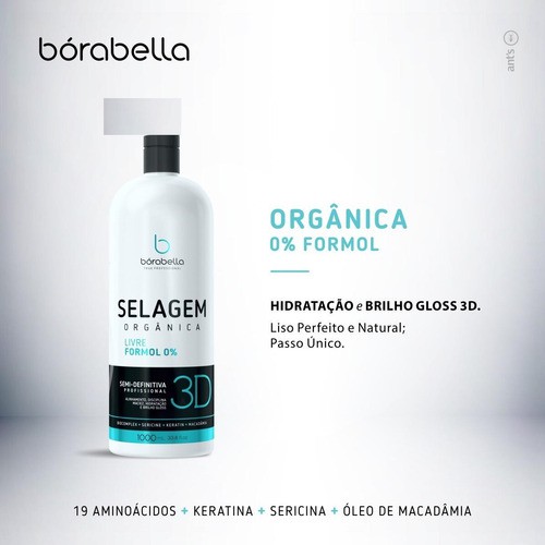Descrição Borabella Selagem 3D Semi Definitiva Orgânica Passo Único - 350ml Proporciona cabelos selados, disciplinados, soltos, leves, macios, com brilho intenso, volume controlado, completamente livre do frizz e dos fios rebeldes, Nossa formulação contém ativos orgânicos modernos, e o exclusivo Blend Bio Complex formado pela sinergia de óleos vegetias, protéinas, aminoácidos que provem a reordenação da estrutura do córtex e da cutícula capilar, resultando e cabelos naturalmente solto, macio, comportado e brilhante, por um longo período. Sua formulação inovadora contém ativos modernos de baixo peso molecular que atuam reestruturando o córtex e reorganizando as cutículas, além de tratar completamente o fio. Tudo isso graças ao blend de ativos exclusivos chamado BioComplex formados por Ácido Hialurônico + Glutâmico + Aspártico + 19 Aminoacidos + Keratina + Proteína da Seda + Óleo de Macadâmia.