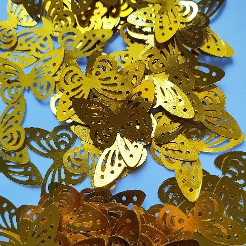 50 Borboletas Dourada - papel Lamicote Borboleta Encanto Dourada Ideal para decoração de lembrancinhas de festa 💓 Servem para enfeitar os copinhos 💓 colheres do doce de colher 💓 colar na ponta de lápis e enfeitar a mesa dos convidados 💓 colar nos brindes 💓 nas forminhas de doces da mesa 💓fechar os convites 💓 ser feito como plaquinhas para por em doces 💓 Basta colar em mexedores de café 💓muro verde 💓 cordões de nylon penduradas, sobre a mesa 💓sobre flores 💓 podem ser usadas em diversas possibilidades criativas 🦋