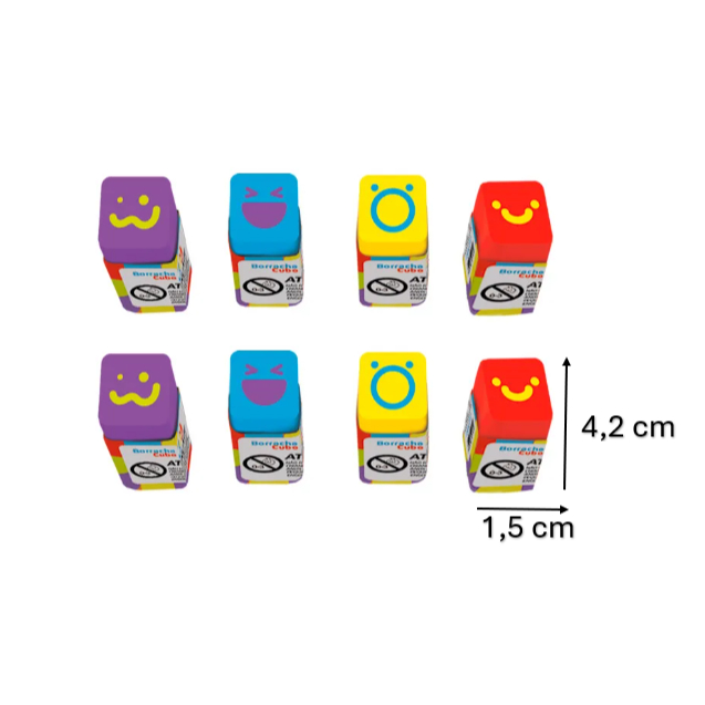 Temos kit com 8 borrachas ou 16 borrachas Cada pacote vai com 8 borracha com 4 cores, 2 cores de cada. Na opção de 16 borrachas , será enviado 2 pacotes de 8 unidades. Medidas: 4.2 cm de comprimento 1,5 cm largura 1,5 cm Altura Se uma borracha com rostinho já é divertida, imagine quatro! Assim é a Borracha Cubo Leo&Leo: satisfação multiplicada por quatro. Feita com borracha injetada, ela vem com estampa em todo seu corpo, em 4 cores vibrantes distintas (roxo, amarelo, azul e vermelho), com estampas divertidas de rostinhos que expressam 4 variadas emoções. É apagar o que for preciso e se divertir com as carinhas! Produzida com borracha isenta de PVC, carga inerte e pigmentos atóxicos, a Borracha Cubo Decorada Leo&Leo é a companhia mais alegre das crianças na escola em todos os momentos.