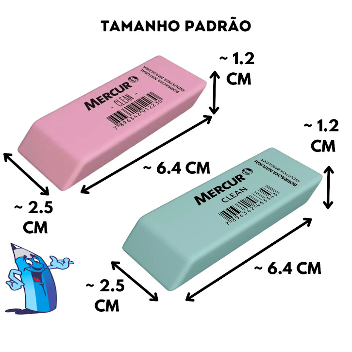 *ESCOLHA A COR NA OPÇÃO DE VARIAÇÕES!!! *NÃO SERÁ POSSÍVEL ALTERAR A COR DO PRODUTO APÓS A FINALIZAÇÃO DA COMPRA!!! O QUE VOCE RECEBERÁ: 1 KIT com: -12 unidades da BORRACHA ESCOLAR MERCUR CLEAN da cor escolhida A BORRACHA ESCOLAR MERCUR CLEAN é a escolha perfeita para quem busca qualidade e precisão. Sua fórmula especial não mancha o papel, garantindo que seus desenhos e anotações permaneçam impecáveis. Além disso, é mais macia, proporcionando uma experiência mais suave e agradável ao apagar. Ideal para apagar escritos com lápis ou lapiseira, ela é indicada para qualquer graduação de grafite. Agora, você pode adquirir a BORRACHA ESCOLAR MERCUR CLEAN em caixa fechada com 12 unidades, garantindo um estoque completo para sua escola, escritório ou organização pessoal! BENEICIOS Não mancha o papel. Mais macia, proporcionando melhor sensação ao apagar. Apaga escrita a lápis e lapiseira. Vendida em KIT de 12 unidades, ideal para reposição. DESCRIÇÃO DO PRODUTO: Marca: Mercur DIMENSOES: 2 CM x 6.4 CM X 1.2 CM *ESCOLHA A COR NA OPÇÃO DE VARIAÇÕES!!! CORES DISPONÍVEIS, ROSA E; VERDE ******* Quem Somos ******* Atuando na área do comércio varejista, especializado em material escolar e escritório, iniciou as atividades em 2005 e desde então nos dedicamos a oferecer produtos de qualidade e atendimento diferenciado a nossos clientes. * Produtos À PRONTA ENTREGA! * Suporte e auxílio a nossos clientes. * Envio RÁPIDO! * QUALIDADE garantida!