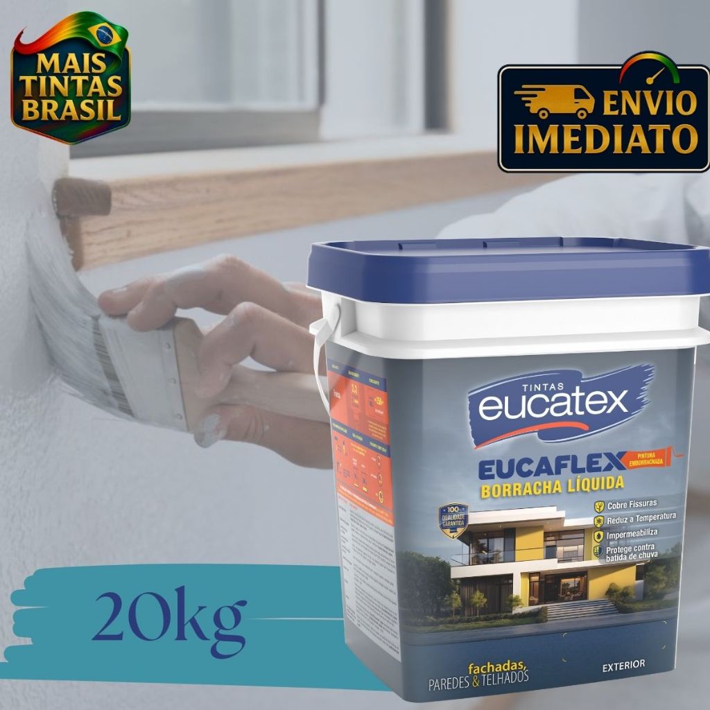 Descrição do Produto:Tinta Emborrachada Impermeabilizante Eucaflex Borracha Líquida é o revestimento elastomérico de alta performance que você estava procurando! Com tecnologia avançada, essa tinta oferece uma solução completa para proteção e embelezamento das suas superfícies externas. Descubra agora os benefícios incríveis de Eucaflex e como ela pode transformar seus projetos.Características Principais:• Alta cobertura e bom rendimento: Economize tempo e dinheiro com uma aplicação eficiente e duradoura.• 100% de elasticidade do filme: Flexibilidade máxima para acompanhar os movimentos das superfícies sem trincar.• Cobertura de fissuras de até 0,3 mm: Superfícies lisas e uniformes, sem imperfeições.• Redução de temperatura: Conforto térmico, mantendo seus ambientes mais frescos.• Impermeabilização completa: Proteção contra infiltrações, mantendo suas áreas sempre secas.• Hidro repelente: Resistente à água, prolongando a durabilidade das superfícies.• Proteção contra batida de chuva: Seus espaços sempre protegidos, mesmo nas condições climáticas mais severas.• Acabamento fosco: Um toque elegante e sofisticado para suas áreas externas.Características de Destaque:Imagine suas superfícies externas protegidas contra todas as intempéries, com um acabamento impecável e duradouro. Com Eucaflex Borracha Líquida, você terá a tranquilidade de saber que suas áreas estão impermeabilizadas e protegidas, garantindo conforto e estética por muitos anos.Sem a proteção de Eucaflex, suas superfícies podem sofrer com infiltrações, trincas e danos causados pela chuva e mudanças de temperatura. A falta de um revestimento adequado pode resultar em altos custos de reparo e manutenção, além de comprometer a aparência e a estrutura dos seus espaços.A aplicação de Eucaflex Borracha Líquida é simples e prática. Com alta cobertura e rendimento, você pode aplicar o produto diretamente sobre a alvenaria, paredes, telhados de fibrocimento e outras superfícies externas. Em pouco tempo, suas áreas estarão protegidas, impermeabilizadas e com um acabamento fosco de alta qualidade.Dados Técnicos:Produto: Borracha Líquida (Eucaflex)Acabamento: FoscoMarca: EucatexVolume: 20kgComposição: Resina à base de dispersão aquosa de copolímero elastomérico, aditivos microbicidas, pigmentos isentos de metais pesados, cargas minerais inertes, glicóis e tensoativo.Cor: ChromiumDILUIÇÃO:Antes de diluir misture bem a tinta e use sempre água limpa.ROLO DE PELO ALTO, PINCEL E TRINCHA - 10% de água em todas as demãos.AIRLESS - 20% de água em todas as demãos.Demãos: 2 a 3 demãos com intervalo de 4 horas entre demãos.Secagem: Ao toque: 2 horas. Entre demãos: 4 horas. Final: 12 horas.Rendimento: Balde - 20Kg: Até 250m² por demão/ m².Superfície:Uso externo.Alvenaria (fachadas de casas, prédios e barracões)TelhadosEmbalagem: Balde 20kg.Aplicação:Para garantir o melhor resultado com a Tinta Borracha Líquida Eucatex, siga estas instruções de aplicação:• Rolo de lã de pelo alto: Ideal para grandes superfícies, o rolo de lã de pelo alto facilita a aplicação uniforme da tinta, garantindo alta cobertura e acabamento impecável.• Pincel ou trincha: Perfeito para detalhes e áreas menores, o pincel ou trincha permite maior controle e precisão na aplicação.• Airless: Utilize a pulverização airless para uma aplicação rápida e eficiente, especialmente em grandes áreas ou superfícies com textura.Como aplicar?1. Preparação da superfície: Certifique-se de que a superfície esteja limpa, seca e livre de poeira, graxa ou outros contaminantes. Para melhores resultados, aplique um fundo preparador adequado.2. Agitação: Misture bem a tinta antes de usar para garantir uma consistência uniforme.3. Aplicação da primeira demão: Com o rolo de lã de pelo alto, pincel ou airless, aplique uma camada uniforme de Eucaflex Borracha Líquida. Deixe secar completamente.4. Aplicação de demãos adicionais: Para garantir uma impermeabilização completa e acabamento perfeito, aplique pelo menos duas demãos, respeitando o tempo de secagem entre elas.5. Finalização: Após a aplicação das demãos necessárias, deixe a superfície secar completamente antes de expô-la às condições climáticas.