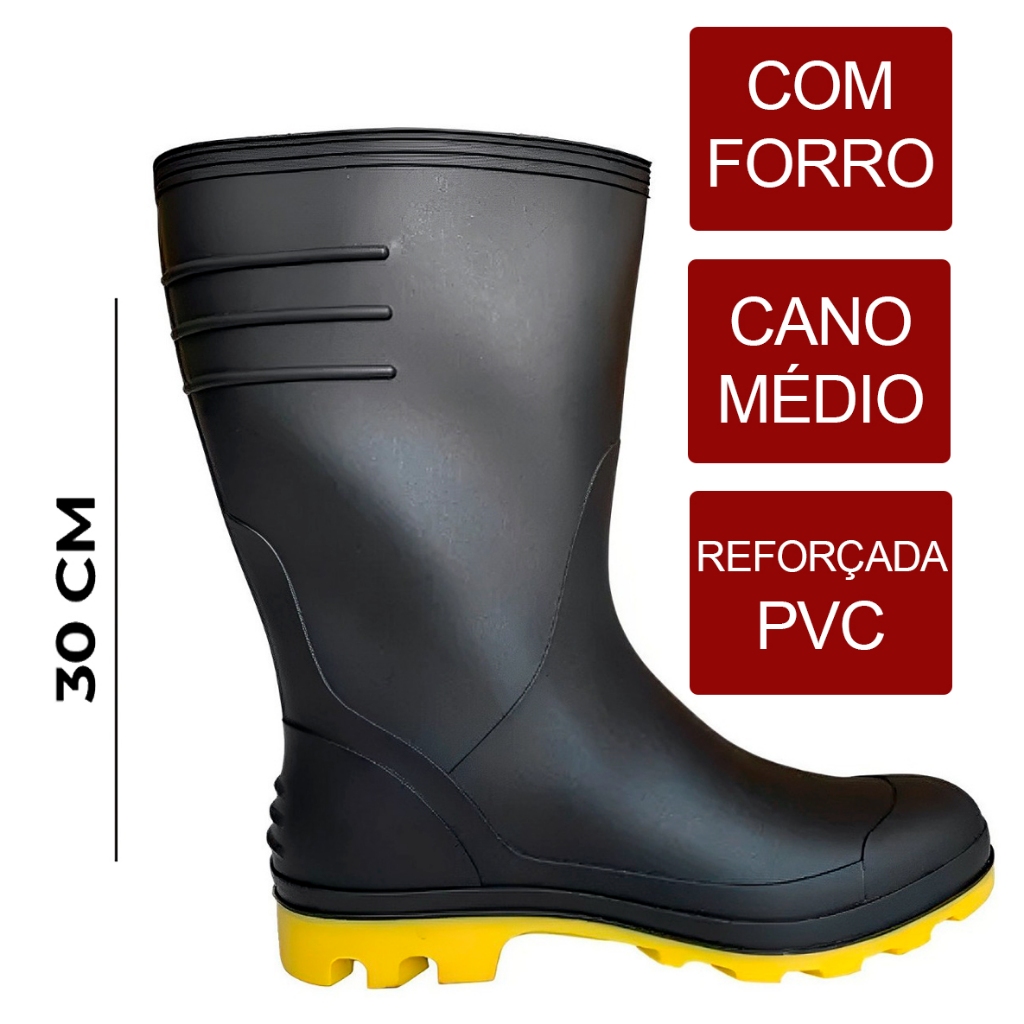 Cor: Preta e amarela Material do calçado PVC Acabamento interno do calçado: Com forro Tamanho do cano do calçado: Cano médio Medida do cano do calçado: 30,0 cm Tipo de solado do calçado: PVC Tipo de biqueira: Sem biqueira Palmilha: Sem Observação: Não utilizar para combate a incêndio Massa aproximada (peso): 1.275 kg Produto altamente resistente à gordura animal, outros tipos de gorduras, fungos, bactérias, ambientes refrigerados, ácidos, óleos, solventes, graxas e hidrocarbonetos em geral (derivados de petróleo). Calçado ideal para atividades com produtos químicos em geral, onde se exija alta performance do produto. Indústrias químicas, petroquímicas, plataformas petrolíferas, postos de combustíveis, transporte e armazenagem de produtos perigosos, construção civil, usinas de cana-de-açúcar, saneamento básico, agricultura, jardinagem, entre outras. ****Bastante utilizada por motociclistas, pois o solado facilita a visibilidade e sinaliza atenção aos outros motoristas.**** Indicada para proteção dos pés do usuário contra riscos de natureza leve, contra agentes abrasivos e escoriastes, e contra umidade proveniente de operações com uso de água. Utilizada na construção civil, postos de gasolina, lojas de motopeças, agroindústrias, atividades agrícolas, pesca, entre outros. Tamanho do pé em cm. 36 – 28 cm 37 – 26 cm 38 – 26 cm 39 – 29 cm 40 – 30 cm 41 – 30 cm 42 – 31 cm 43 – 28,5 cm 44/45 - 29 cm