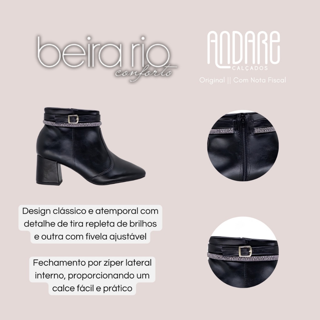 FORMA: Normal (Ver tabela de medidas) CABEDAL: Material sintético de alta qualidade FORMATO DO BICO: Fino ALTURA DO CANO: 11cm CIRCUNFÊRENCIA DO CANO: 33cm PALMILHA: Anatômica Macia FECHAMENTO: Zíper lateral SALTO: 6.5cm SOLADO: PVC Antiderrapante ENVIO: Na caixa do fabricante GARANTIA: Contra defeitos de fabricação - 30 dias A Bota Feminina Cano Baixo Beira Rio é a escolha perfeita para mulheres que valorizam elegância, conforto e versatilidade em um único calçado. Com um visual moderno que combina com diversas ocasiões, ela transita com facilidade entre produções casuais e mais sofisticadas, sendo ideal para compor composições de meia estação e inverno com muito estilo. Um modelo pensado para quem busca praticidade sem abrir mão de um toque fashion no dia a dia. Confeccionada em material sintético de alta qualidade, essa bota alia durabilidade e sofisticação. Seu acabamento primoroso garante uma aparência refinada, além de oferecer resistência ao uso frequente. O material proporciona excelente estrutura ao calçado, mantendo sua forma e beleza mesmo após diversas utilizações, sem perder o conforto característico da marca Beira Rio. O design clássico e atemporal é um dos grandes atrativos do modelo. O destaque fica por conta das tiras decorativas: uma repleta de brilhos sutis que adicionam um toque glamouroso ao visual, e outra com fivela ajustável, que confere charme e elegância. Essas aplicações fazem com que a bota se destaque de forma discreta, oferecendo um equilíbrio entre o tradicional e o moderno. Seu fechamento é feito por zíper lateral na parte interna, facilitando o calce e proporcionando maior praticidade no dia a dia. O cano possui aproximadamente 11 cm de altura e 33 cm de circunferência, garantindo um encaixe confortável e anatômico ao redor do tornozelo, sem apertar. Esse formato proporciona liberdade de movimento e um visual harmonioso que valoriza o contorno das pernas. Por dentro, a bota é totalmente forrada e acolchoada, oferecendo uma sensação de aconchego a cada passo. A palmilha anatômica é extremamente macia e foi desenvolvida para garantir o máximo de conforto, promovendo amortecimento eficiente e bem-estar mesmo durante longos períodos de uso. Ideal para mulheres que estão sempre em movimento e não abrem mão do conforto. O salto é do tipo bloco com altura de 6,5 cm, proporcionando não apenas um toque moderno ao visual, mas também maior estabilidade ao caminhar. Esse tipo de salto é perfeito para o dia a dia, pois distribui melhor o peso do corpo, evitando desconfortos e permitindo o uso prolongado sem comprometer a postura ou o equilíbrio. O solado conta com frisos antiderrapantes estrategicamente posicionados, proporcionando excelente aderência em diferentes tipos de superfície. Essa característica garante mais segurança em cada passo, tornando essa bota ideal para enfrentar desde o ritmo acelerado da cidade até os dias de clima mais instável, com muito mais confiança e elegância. TABELA DE MEDIDAS Tamanho 34 - 24.4cm Tamanho 35 - 25cm Tamanho 36 - 25.6cm Tamanho 37 - 26.8cm Tamanho 38 - 28.2cm Tamanho 39 - 28.8cm