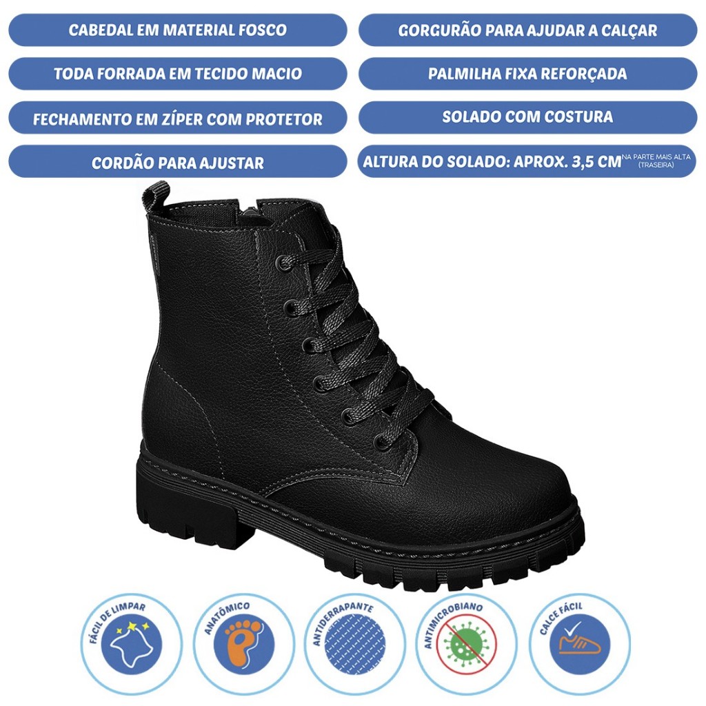 O Coturno tem formato anatômico que segue o desenho do pezinho e é super fofinho, pois é todo revestido em tecido. Ele é resistente, dá segurança e firmeza aos passinhos da meninada e ainda protege do frio. É perfeito para compor looks estilosos para passeio e super prático, pois possui fechamento em zíper. Conta também com cadarço para um ajuste perfeito. **********TABELA DE MEDIDAS*********** 23 ------------------ 16,20 cm 24 ------------------ 16,80 cm 25 ------------------ 17,40 cm 26 ------------------ 18,10 cm 27 ------------------ 18,80 cm 28 ------------------ 19,30 cm 29 ------------------ 19,80 cm 30 ------------------ 20,50 cm 31 ------------------ 21,10 cm 32 ------------------ 21,80 cm 33 ------------------ 22,50 cm 34 ------------------ 23,00 cm 35 ------------------ 23,70 cm 36 ------------------ 24,30 cm OBS: À cada medida feita, adicione pelo menos meio centímetro para que o pé fique confortável no calçado. Afinal, nenhum sapato fica exatamente do mesmo tamanho dos pés. DETALHES DO PRODUTO Fechamento: Cadarço e Zíper Material Externo: Sintético Material Interno: Têxtil Material da Palmilha: Têxtil Material da Sola: PVC Expandindo Cor: Preto Altura do cano: Médio