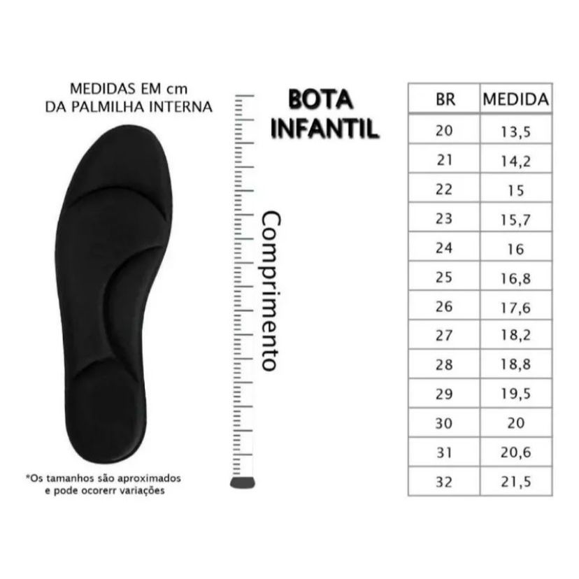 Somos da empresa Agro Country Botinas! estamos aqui para falar para vocês, que nós temos a missão de dar a satisfação total ao cliente tanto nos produtos quanto no atendimento ! Trabalhamos com dedicação e muito amor ! Somos loja de fábrica e trazemos para vocês, calcados direto de FRANCA SP, a capital do calçado de qualidade. E lembre-se se qualquer dúvida estamos à disposição ! O jeito mais FACIL e PRATICO de comprar é conosco! Essa é para TODOS OS papais, mamães, avós, tios, padrinhos, que procuram agradar seus pequeninos com estilo, conforto e qualidade! compre AGORA o melhor pra seu filho e deixe ele com estilo e conforto!!!!!! Garanta as suas Botas Infantis em Couro Legítimo com um Precinho super especial ! Características e especificações Tipo de calçado: Botas Material do calçado: Couro legítimo Elastico nas laterais para facilitar o calce Solado colado e costurado Palmilha Fixa PRONTA ENTREGA ENVIAMOS PARA TODO BRASIL DIRETO DE FABRICA COM NOTA FISCAL FOTOS REAIS TECIDO, MODELAGEM e ACABAMENTO PREMIUM. Tabela de medidas Numeração 20 possui 13.5 cm Numeração 21 possui 14.2 cm Numeração 22 possui 15.0 cm Numeração 23 possui 15.7 cm Numeração 24 possui 16.0 cm Numeração 25 possui 16.8 cm Numeração 26 possui 17.6 cm Numeração 27 possui 18.2 cm Numeração 28 possui 18.8 cm Numeração 29 possui 19.5 cm Numeração 30 possui 20.0 cm Numeração 31 possui 20.6 cm Numeração 32 possui 21.5 cm DÚVIDAS FREQUENTES: 1 – É recomendado pegar um tamanho maior ? Resposta: SIM . Recomendamos comprar um tamanho a mais PARA MELHOR CONFORTO DAS NOSSAS CRIANÇAS. Lembrando que nossos calçados possuem uma forma padrão .Verifique também a tabela de medidas disponível nesse anúncio para auxiliar na escolha do tamanho correto. 2 – Tem os produtos a pronta entrega? Em quanto tempo o produto será enviado? Resposta: Sim, temos todos os nossos produtos a pronta entrega para envio imediato. Após efetuar a compra, seu pedido será postado em até 24 horas uteis. 3 – O produto é resistente? Resposta: Sim, nossas peças são fabricadas com as melhores matérias primas do mercado e seguimos um rigoroso controle de qualidade para trazer o melhor para nossos cliente . Estamos a disposição para ajudar com qualquer dúvida