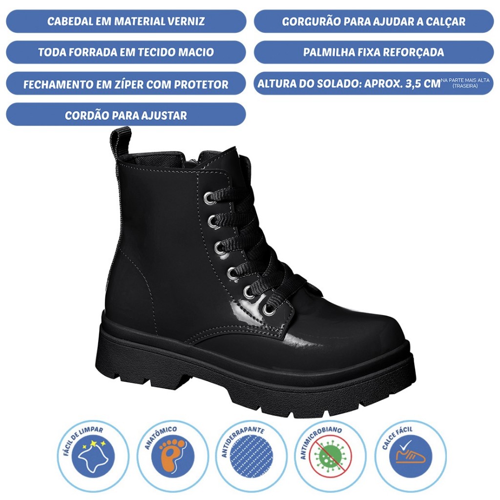 O Coturno tem formato anatômico que segue o desenho do pezinho e é super fofinho, pois é todo revestido em tecido. Ele é resistente, dá segurança e firmeza aos passinhos da meninada e ainda protege do frio. É perfeito para compor looks estilosos para passeio e super prático, pois possui fechamento em zíper. Conta também com cadarço para um ajuste perfeito. **********TABELA DE MEDIDAS*********** 23 ------------------ 14,90 cm 24 ------------------ 15,90 cm 25 ------------------ 16,50 cm 26 ------------------ 17,30 cm 27 ------------------ 18,10 cm 28 ------------------ 19,30 cm 29 ------------------ 19,80 cm 30 ------------------ 20,60 cm 31 ------------------ 21,00 cm 32 ------------------ 21,80 cm 33 ------------------ 22,50 cm 34 ------------------ 23,00 cm 35 ------------------ 23,70 cm 36 ------------------ 24,30 cm OBS: À cada medida feita, adicione pelo menos meio centímetro para que o pé fique confortável no calçado. Afinal, nenhum sapato fica exatamente do mesmo tamanho dos pés. DETALHES DO PRODUTO Fechamento: Cadarço e Zíper Material Externo: Sintético Material Interno: Têxtil Material da Palmilha: Têxtil Material da Sola: PVC Expandindo Cor: Preto Altura do cano: Baixo