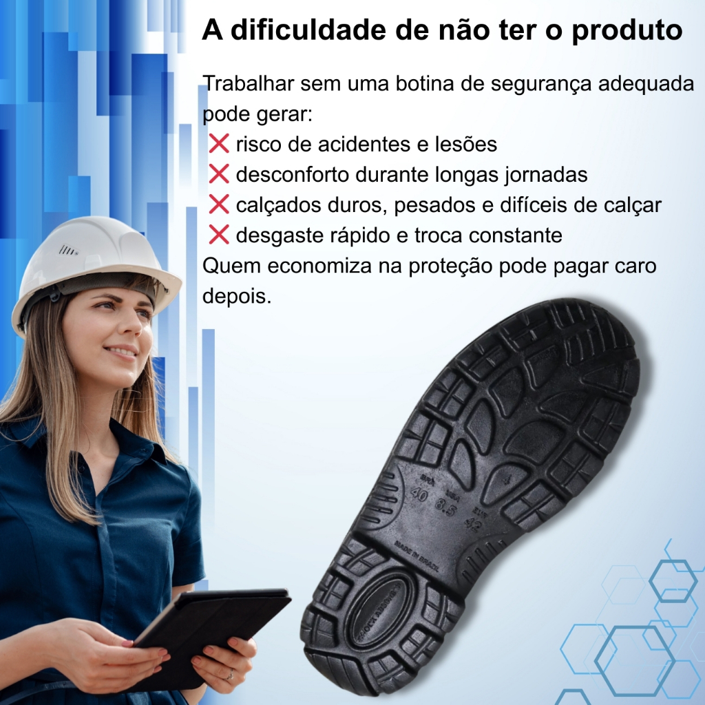 🥾 Botina de Segurança com Elástico Imbiseg – CA 17015 1️⃣ Apresentação do produto A Botina de Segurança Imbiseg CA 17015 foi desenvolvida para quem precisa de proteção, conforto e praticidade no dia a dia de trabalho. Com elástico lateral, ela oferece calce rápido, ajuste firme aos pés e alto desempenho em ambientes profissionais, sendo ideal para indústria, logística, obras e serviços gerais. 2️⃣ A dificuldade de não ter o produto Trabalhar sem uma botina de segurança adequada pode gerar: ❌ risco de acidentes e lesões ❌ desconforto durante longas jornadas ❌ calçados duros, pesados e difíceis de calçar ❌ desgaste rápido e troca constante Quem economiza na proteção pode pagar caro depois. 3️⃣ Os benefícios de ter essa botina ✅ Mais segurança no ambiente de trabalho ✅ Elástico lateral: fácil de calçar e retirar ✅ Conforto prolongado para uso diário ✅ Estabilidade e firmeza ao caminhar ✅ Mais produtividade sem incômodo nos pés Você trabalha com mais confiança, agilidade e tranquilidade todos os dias. 4️⃣ Qualidade e certificação que fazem a diferença ✔ Produto com Certificado de Aprovação (CA 17015) ✔ Material resistente, ideal para uso profissional ✔ Solado robusto, seguro e durável ✔ Marca Imbiseg, reconhecida no mercado de segurança É a botina certa para quem não abre mão de proteção com conforto. 🔥 Invista na sua segurança. Trabalhe protegido todos os dias. Garanta agora a sua Botina Imbiseg CA 17015.