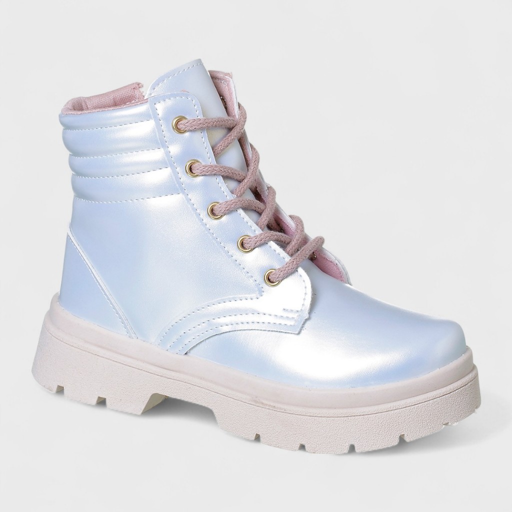 TABELA DE MEDIDAS N° 28 - 18,5 cm N° 29 - 19,5 cm N° 30 - 20 cm N° 31 - 20,5 cm N° 32 - 21 cm N° 33 - 22 cm N° 34 - 22,5 cm Destaque o estilo e o conforto da sua pequena com esta linda bota coturno infantil! Com um design moderno e delicado, o modelo apresenta um acabamento holográfico em tom azul perolado, proporcionando um visual fashion e versátil para diversos benefícios. O coturno conta com fechamento em cadarço rosa claro, passadores metálicos dourados e um forro interno macio para maior conforto durante o uso. Seu solado robusto emborrachado garante segurança e aderência, perfeito para o dia a dia ou momentos especiais. Disponível na numeração 28 ao 34, essa bota é ideal para meninas que amam um look estiloso e cheio de personalidade!