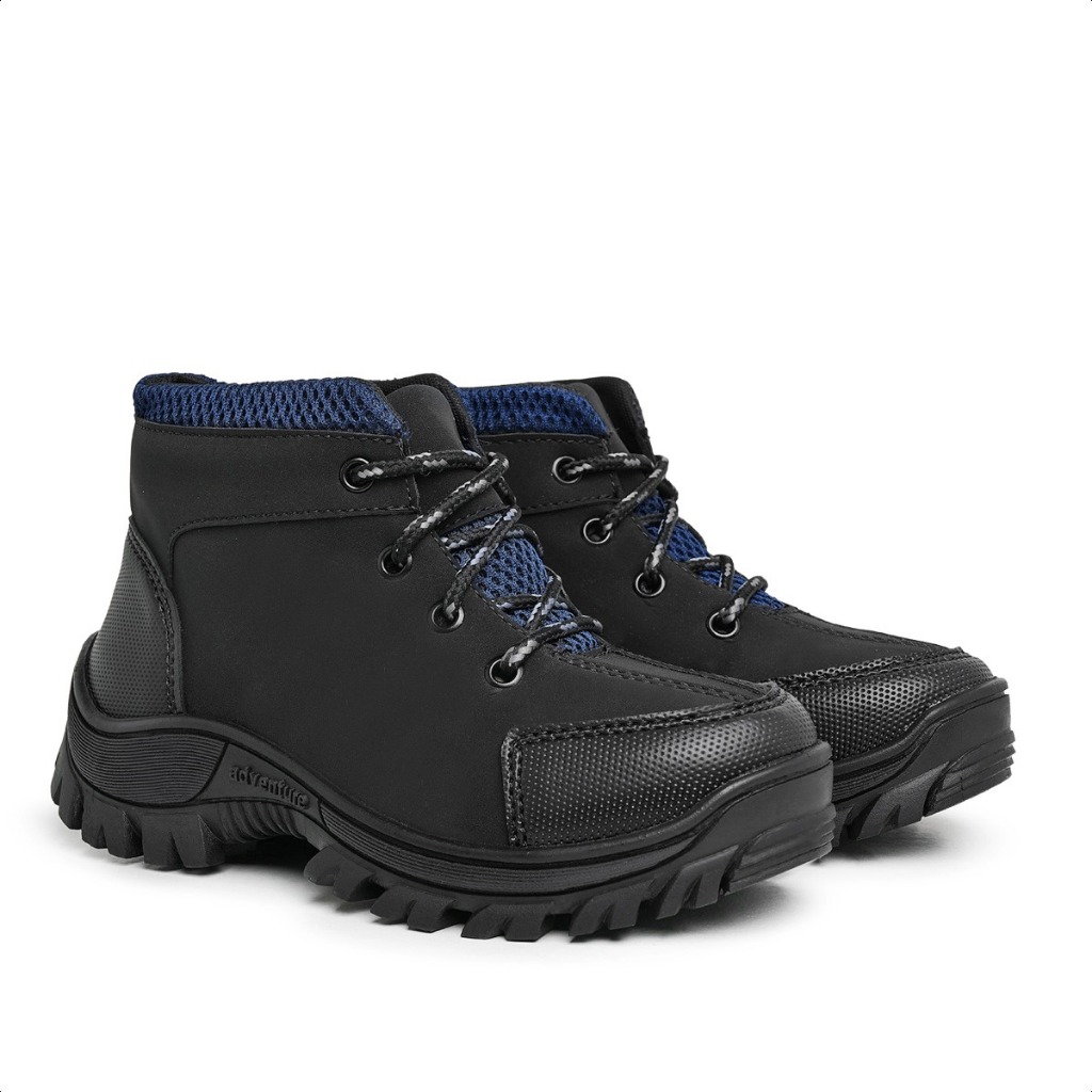 Bota Coturno Preto com Azul Infantil Adventure Tênis Infanto Juvenil Do 27 ao 40 Escolar, Trilha, Lazer e Passeio