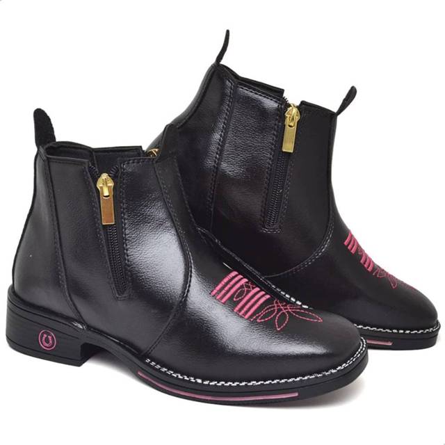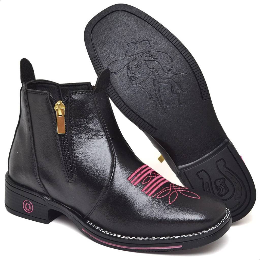 Bota Botina Country Feminina Texana Bico Quadrado com zíper ou Pedra Modelo: Bota Country Feminina Cores: Preto Pink DESCRIÇÃO - Couro Sintético; - Solado de Borracha Antiderrapante; - Elásticos nas laterais ou zíper trazendo uma facilidade para calçar; - Bico Quadrado; - Possui salto traseiro de 4 cm. TAMANHOS / MEDIDAS (PALMILHA) Nº34 - 23,5 cm Nº35 - 24,2 cm Nº36 - 24,7 cm Nº37 - 25,5 cm Nº38 - 26,2 cm Nº39 - 26,9 cm Nº40 - 27,1 cm ENVIO IMEDIATO EM DIAS ÚTEIS. BOAS COMPRAS!!!