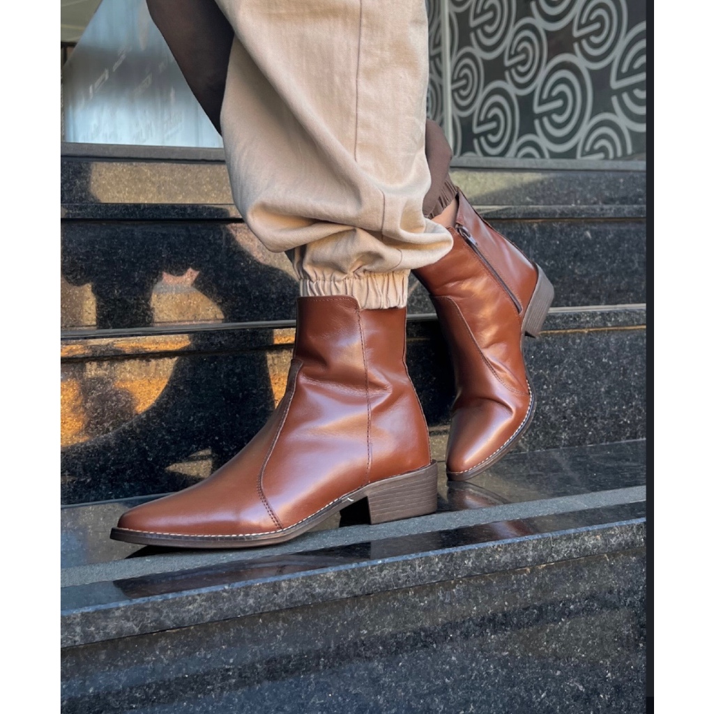 Bota em Couro Legitimo Bico Fino Feminina Cano Curto Conhaque Essenza Loja