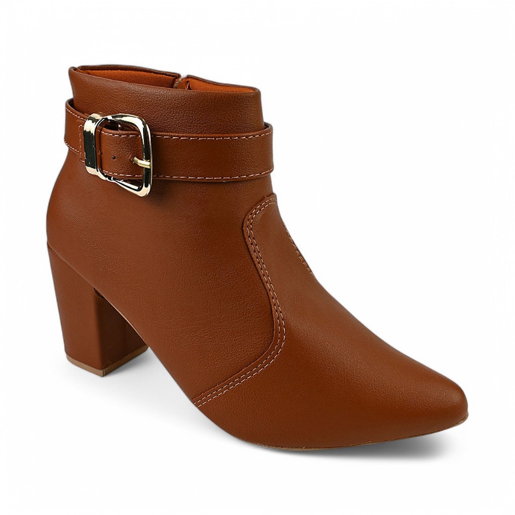Bota Feminina Bico Fino Salto Grosso Fivela Removível e Ziper Lateral