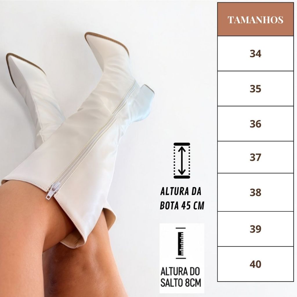 Bota Feminina Cano Alto Salto Bloco 8cm Confortável Zíper Trava Couro Fashion Blogueira Descrição do Produto: ✨ Conforto, elegância e qualidade em uma só bota! A bota feminina de cano alto é o modelo ideal para quem busca estilo e conforto nos dias frios. Produzida em couro sintético premium, possui salto bloco de 8 cm, garantindo estabilidade e sofisticação em cada passo. 🌿 Destaques: 🧵 Material: Couro sintético de alta durabilidade 🦶 Sub-palmilha Eco Confort – mais conforto e absorção de impacto ☁️ Espuma Cacharrel Especial – maciez no contato com a pele 🔒 Zíper com trava e proteção interna 👠 Altura do salto: 8 cm 📏 Altura da bota: 45 cm 🧷 Solado em PVC Gel Injetável Antiderrapante ⚠️ Atenção: Recomendamos escolher um número acima da sua numeração habitual para melhor ajuste. 💃 Ideal para: Eventos, festas, looks de outono/inverno e o dia a dia com muito estilo. Combine com vestidos, saias, calças ou casacos — um toque fashion que nunca sai de moda! 📏 Tamanhos disponíveis: 34 | 35 | 36 | 37 | 38 | 39 | 40 Bota Feminina Cano Alto Salto Bloco 8cm Confortável Zíper Trava Couro Fashion Blogueira.