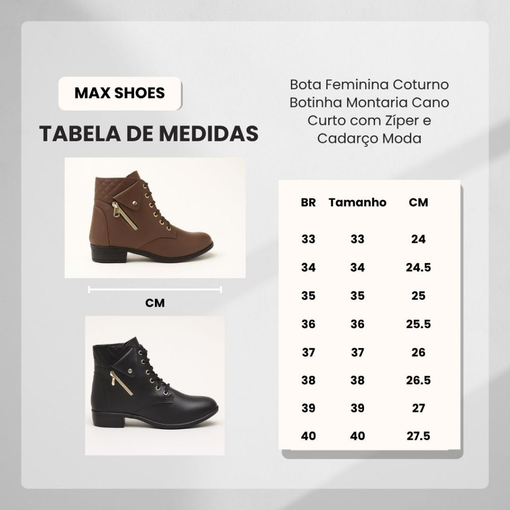 Bota Feminina Cano Curto com Zíper Dourado Combine elegância e atitude com esta bota feminina de cano curto, perfeita para compor looks modernos e versáteis. O detalhe do zíper dourado lateral e o acabamento acolchoado no tornozelo trazem um toque de sofisticação ao design urbano. Detalhes do Produto: Material Externo: Couro sintético de alta qualidade, com acabamento liso. Fechamento: Cadarço frontal com passadores metálicos dourados e zíper decorativo lateral. Destaque Visual: Detalhe acolchoado com costura matelassê na parte superior do cano. Solado: Borracha antiderrapante com leve salto baixo, ideal para conforto e segurança ao caminhar. Forro Interno: Têxtil acolchoado, que garante conforto térmico e maior bem-estar. Cor: Preto e Capuccino com detalhes dourados Numeração disponível: 33 - 40 TABELA DE MEDIDAS BR COMPRIMENTO CM 33 BR 24 cm 34 BR 24.5 cm 35 BR 25 cm 36 BR 25.5 cm 37 BR 26 cm 38 BR 26.5 cm 39 BR 27 cm 40 BR 27.5 cm Versatilidade: Ideal para o dia a dia, passeios e até para o trabalho. Fica linda com jeans, leggings, saias ou vestidos. Um modelo coringa para seu guarda-roupa!
