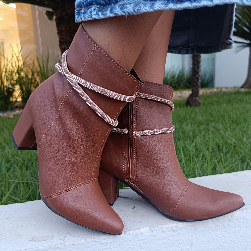 Bota Feminina Fashion Bico Fino com Tiras de Strass Salto Bloco Confortável Elegante