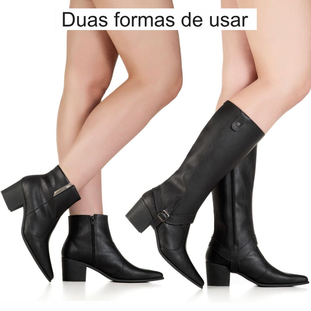 CALÇA O NÚMERO EXATO. Material Externo - Napa Sintética Macia. Material Interno - Material Têxtil com espuma macia. Altura do salto (atrás) - 6 cm. Altura do cano - 14 cm (Cano Curto) Altura do cano - 35 cm (Cano Longo) Palmilha - Espuma, EVA e cacharrel. Material da Sola - Micro Gel - Leve e Flexível - PROTEÇÃO DO ENVIO: Caixa individual - Embalada com Envelope Plástico Resistente. - FOTO: real do nosso produto. Bota 2 em 1.... você pode usar essa bota em duas versões, com cano alto ou com cano curto, para usar com o cano longo você vai calçar primeiro o cano e em seguida colocar a bota, ajustar a fivela passando por baixo da sola e abotoando na lateral e depois fechar o zíper interno. Na versão cano curto, essa bota é fácil de combinar, e possui um detalhe metalizado lateral, que dá um charme extra à bota Outra vantagem dessa bota é que o cano dela possui uma faixa de material com stretch (material que estica), o que facilita o ajuste em diferentes medidas de perna. Além do design moderno e versátil, ela possui um bico fino alongado e salto grosso médio, proporcionando conforto, segurança e estabilidade ao caminhar CONSERVAÇÃO: * Para conservar o seu modelo novo e bonito por muito mais tempo é fundamental seguir algumas recomendações: - A limpeza deve ser feita com sabão neutro e pano úmido e não deve ficar de molho. Não usar nenhuma fonte de calor para secar. Guardar em local sem umidade e deixar descansar na sombra por 12 horas após o uso. - Não utilize Máquina de lavar e secar. - Independente do material do seu sapato, não esfregue com força ou passe esponjas grossas. - Caso alguma dessas indicações não forem cumpridas, isso poderá danificar os materiais, a cor e a textura do seu calçado. GiGiL - SEU ESTILO COM UM CLIQUE! Somos uma marca de moda, criativa e antenada. Nosso foco é criar calçados com qualidade e preço justo. Superar suas expectativas e oferecer praticidade de compra são nossos objetivos.