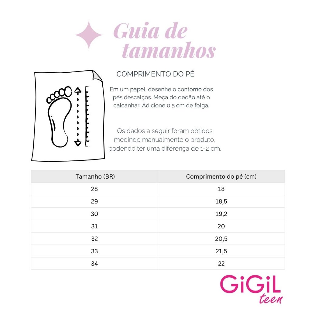 CALÇA O NÚMERO EXATO. Material Externo - Napa Soft Conforto Macia Com Tira Strass Glitter. Material Interno - Material Têxtil com espuma macia. Altura do salto - 4,0 cm. Altura do cano - 16,0 cm. Palmilha - Espuma Confortável com aplique da logo. Material da Sola - Micro Gel - Leve e Flexível. - PROTEÇÃO DO ENVIO: Caixa individual - Embalada com Envelope Plástico Resistente. - FOTO: real do nosso produto. ** Preparamos seu pedido e despachamos em 24 h (Exceto Sábado e Domingo). A Botinha da Gigil Teen é perfeita para as meninas que querem estar na moda! Seu modelo de cano curto e detalhe lateral com strass traz um toque de elegância e sofisticação, uma ótima opção para compor looks modernos e cheios de estilo. CONSERVAÇÃO: * Para conservar o seu modelo novo e bonito por muito mais tempo é fundamental seguir algumas recomendações: - A limpeza deve ser feita com sabão neutro e pano úmido e não deve ficar de molho. Não usar nenhuma fonte de calor para secar. Guardar em local sem umidade e deixar descansar na sombra por 12 horas após o uso. - Não utilize Máquina de lavar e secar. - Independente do material do seu sapato, não esfregue com força ou passe esponjas grossas. - Caso alguma dessas indicações não forem cumpridas, isso poderá danificar os materiais, a cor e a textura do seu calçado. GiGiL TEEN - SEU ESTILO COM UM CLIQUE! Somos uma marca de moda, criativa e antenada. Nosso foco é criar calçados com qualidade e preço justo. Superar suas expectativas e oferecer praticidade de compra são nossos objetivos.