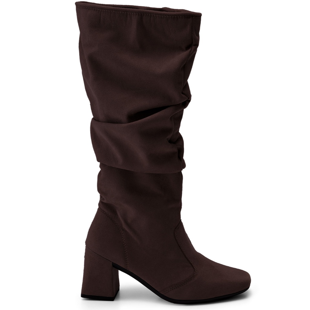 Bota Feminina Lumiss Cano Alto Enrugado Slouchy Salto Bloco Baixo Camurça Suede Marrom