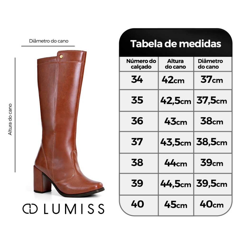 Modelo perfeito para uma dose extra de conforto e modernidade. Essa bota tem um cano alto, com material sintético com acabamento lindo, perfeito para todos os momentos do dia, além de ser um modelo atemporal. ..:::.. ESPECIFICAÇÕES DO PRODUTO ..:::.. *Material Externo - Napa Sintética *Material Interno - Helanca, Material Têxtil Super Confortável *Altura do salto - 8,0 cm. *Solado - PVC, Emborrachado Antiderrapante, Não Faz Barulho, Não Escorrega. *Palmilha - Confortável com aplique da logo. Medida aproximada dos pés para cada numeração: Tamanho 34 --- 23,4 cm Tamanho 35 --- 24,0 cm Tamanho 36 --- 24,7 cm Tamanho 37 --- 25,2 cm Tamanho 38 --- 26,0 cm Tamanho 39 --- 26,2 cm Tamanho 40 --- 27,4 cm SOBRE A LUMISS: Desde 2018, brilha no coração da Lumiss a inovação para calçados femininos. Nascida como Amorelle, a marca é fruto do sonho de um visionário que sempre acreditou na possibilidade de fabricar calçados que surpreendessem o mercado, tanto pela variedade quanto por seus preços acessíveis. Com muito trabalho em família, essa ideia foi levada adiante, fortalecendo uma marca que hoje é referência nacional em calçados femininos, com presença marcante nos marketplaces e mais de dois milhões de pares já entregues em todo o Brasil. Comprometida com cada cliente, a Lumiss oferece as maiores tendências do mundo da moda a partir de materiais que garantem conforto, qualidade, sofisticação e estilo aos pés da mulher brasileira, encantando até mesmo os perfis mais exigentes. Além disso, a empresa se preocupa em oferecer a melhor experiência de compra, com total segurança e praticidade. Lumiss é mais que uma marca. É uma ideia que chegou para mostrar que todas as mulheres podem brilhar e ser ainda mais lindas e confiantes com calçados que as valorizam em todos os aspectos.