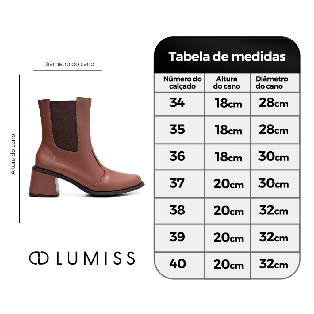 Bota feminina de cano baixo com salto bloco, que garante conforto e estabilidade ao caminhar. O detalhe lateral em elástico facilita o calce, enquanto o design moderno e versátil complementa diferentes produções do dia a dia. ..:::.. ESPECIFICAÇÕES DO PRODUTO ..:::.. *Material Externo - Napa Sintética *Material Interno - Helanca, Material Têxtil Super Confortável *Altura do salto - 6,5 cm. *Solado - PVC Expandido, Emborrachado, Antiderrapante, Não Faz Barulho, Não Escorrega. *Palmilha - Confortável com aplique da logo. Medida aproximada dos pés para cada numeração: Tamanho 34 --- 24,5 cm Tamanho 35 --- 25,0 cm Tamanho 36 --- 25,5 cm Tamanho 37 --- 26,5 cm Tamanho 38 --- 27,0 cm Tamanho 39 --- 27,5 cm Tamanho 40 --- 28,5 cm SOBRE A LUMISS: Desde 2018, brilha no coração da Lumiss a inovação para calçados femininos. Nascida como Amorelle, a marca é fruto do sonho de um visionário que sempre acreditou na possibilidade de fabricar calçados que surpreendessem o mercado, tanto pela variedade quanto por seus preços acessíveis. Com muito trabalho em família, essa ideia foi levada adiante, fortalecendo uma marca que hoje é referência nacional em calçados femininos, com presença marcante nos marketplaces e mais de dois milhões de pares já entregues em todo o Brasil. Comprometida com cada cliente, a Lumiss oferece as maiores tendências do mundo da moda a partir de materiais que garantem conforto, qualidade, sofisticação e estilo aos pés da mulher brasileira, encantando até mesmo os perfis mais exigentes. Além disso, a empresa se preocupa em oferecer a melhor experiência de compra, com total segurança e praticidade. Lumiss é mais que uma marca. É uma ideia que chegou para mostrar que todas as mulheres podem brilhar e ser ainda mais lindas e confiantes com calçados que as valorizam em todos os aspectos.