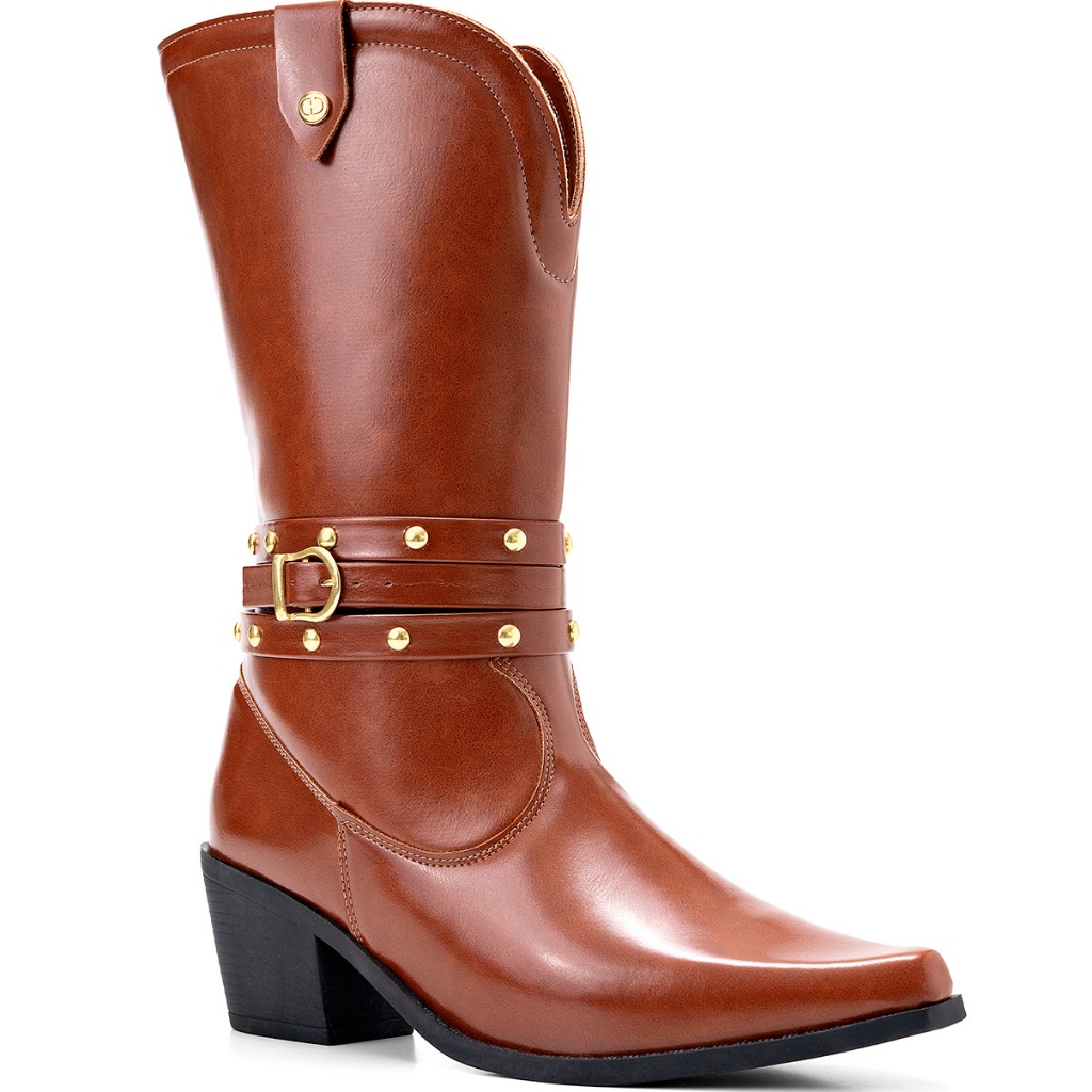 Bota Feminina Lumiss Country Western Cano Médio Salto Baixo Bico Fino Tachas Fivela
