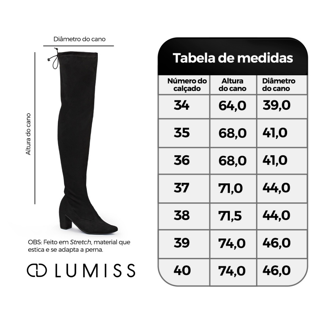 A bota over the knee é um calçado arrojado e cheio de estilo para te acompanhar nos seus eventos mais importantes. Com um material de stretch, ele se ajusta aos diferentes tamanhos de perna. Se você quer marcar presença essa é a bota perfeita. ..:::.. ESPECIFICAÇÕES DO PRODUTO ..:::.. *Material - Napa Soft Comfort Stretch, Suede Comfort Stretch *Solado - Expandido, Emborrachado Anti-Derrapante, não faz barulho, não escorrega. *Altura do salto - 8,0 cm. *Altura do cano - 63,0 cm. *Palmilha - Confortável com aplique da logo. Medida aproximada dos pés para cada numeração: Tamanho 34 --- 25,1 cm Tamanho 35 --- 25,8 cm Tamanho 36 --- 26,5 cm Tamanho 37 --- 27,1 cm Tamanho 38 --- 27,8 cm Tamanho 39 --- 28,5 cm Tamanho 40 --- 29,1 cm SOBRE A LUMISS: Desde 2018, brilha no coração da Lumiss a inovação para calçados femininos. Nascida como Amorelle, a marca é fruto do sonho de um visionário que sempre acreditou na possibilidade de fabricar calçados que surpreendessem o mercado, tanto pela variedade quanto por seus preços acessíveis. Com muito trabalho em família, essa ideia foi levada adiante, fortalecendo uma marca que hoje é referência nacional em calçados femininos, com presença marcante nos marketplaces e mais de dois milhões de pares já entregues em todo o Brasil. Comprometida com cada cliente, a Lumiss oferece as maiores tendências do mundo da moda a partir de materiais que garantem conforto, qualidade, sofisticação e estilo aos pés da mulher brasileira, encantando até mesmo os perfis mais exigentes. Além disso, a empresa se preocupa em oferecer a melhor experiência de compra, com total segurança e praticidade. Lumiss é mais que uma marca. É uma ideia que chegou para mostrar que todas as mulheres podem brilhar e ser ainda mais lindas e confiantes com calçados que as valorizam em todos os aspectos.