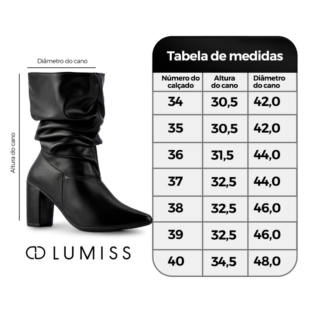 Se você quer um modelo com estilo esse é perfeito para você. O cano tem detalhe enrugado e material super confort, além de um solado perfeito para te acompanhar do dia-a-dia até aquela festa que você precisa de conforto e modernidade. Podemos dizer que a bota bico fino é praticamente um clássico. Ela está marcando presença há um bom tempo e não pretende sair de cena tão rápido. É um modelo que vale a pena você investir, porque você vai usar muito nesse inverno e nos próximos que virão. Podem ser usadas em diferentes produções que tem passe livre entre o dia e à noite. ..:::.. ESPECIFICAÇÕES DO PRODUTO ..:::.. *Material Externo - Napa Soft Confort *Material Interno - Material Têxtil Super Confortável. *Solado - PVC Expandido, Emborrachado Anti-Derrapante, não faz barulho, não escorrega. *Altura do salto - 8,0 cm. *Altura do cano - 21,0 cm. *Palmilha - Confortável com aplique da logo. Medida aproximada dos pés para cada numeração: Tamanho 34 --- 25,1 cm Tamanho 35 --- 25,8 cm Tamanho 36 --- 26,5 cm Tamanho 37 --- 27,1 cm Tamanho 38 --- 27,8 cm Tamanho 39 --- 28,5 cm Tamanho 40 --- 29,1 cm SOBRE A LUMISS: Desde 2018, brilha no coração da Lumiss a inovação para calçados femininos. Nascida como Amorelle, a marca é fruto do sonho de um visionário que sempre acreditou na possibilidade de fabricar calçados que surpreendessem o mercado, tanto pela variedade quanto por seus preços acessíveis. Com muito trabalho em família, essa ideia foi levada adiante, fortalecendo uma marca que hoje é referência nacional em calçados femininos, com presença marcante nos marketplaces e mais de dois milhões de pares já entregues em todo o Brasil. Comprometida com cada cliente, a Lumiss oferece as maiores tendências do mundo da moda a partir de materiais que garantem conforto, qualidade, sofisticação e estilo aos pés da mulher brasileira, encantando até mesmo os perfis mais exigentes. Além disso, a empresa se preocupa em oferecer a melhor experiência de compra, com total segurança e praticidade. Lumiss é mais que uma marca. É uma ideia que chegou para mostrar que todas as mulheres podem brilhar e ser ainda mais lindas e confiantes com calçados que as valorizam em todos os aspectos.