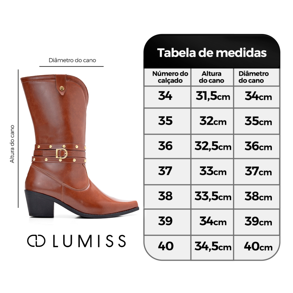 Essa é nossa bota feminina western de cano médio, confeccionada em material liso com acabamento sofisticado. Possui salto baixo que garante conforto no dia a dia e detalhe de tira com fivela e tachas metálicas, trazendo um toque moderno e estiloso. Ideal para compor looks urbanos e versáteis. ..:::.. ESPECIFICAÇÕES DO PRODUTO ..:::.. *Material Externo - Napa Sintética *Material Interno - Helanca, Material Têxtil Super Confortável *Altura do salto - 6,0 cm. *Solado - PVC, Emborrachado Antiderrapante, Não Faz Barulho, Não Escorrega. *Palmilha - Confortável com aplique da logo. Medida aproximada dos pés para cada numeração: Tamanho 34 --- 22,6 cm Tamanho 35 --- 23,3 cm Tamanho 36 --- 24,0 cm Tamanho 37 --- 24,6 cm Tamanho 38 --- 25,3 cm Tamanho 39 --- 26,0 cm Tamanho 40 --- 26,6 cm SOBRE A LUMISS: Desde 2018, brilha no coração da Lumiss a inovação para calçados femininos. Nascida como Amorelle, a marca é fruto do sonho de um visionário que sempre acreditou na possibilidade de fabricar calçados que surpreendessem o mercado, tanto pela variedade quanto por seus preços acessíveis. Com muito trabalho em família, essa ideia foi levada adiante, fortalecendo uma marca que hoje é referência nacional em calçados femininos, com presença marcante nos marketplaces e mais de dois milhões de pares já entregues em todo o Brasil. Comprometida com cada cliente, a Lumiss oferece as maiores tendências do mundo da moda a partir de materiais que garantem conforto, qualidade, sofisticação e estilo aos pés da mulher brasileira, encantando até mesmo os perfis mais exigentes. Além disso, a empresa se preocupa em oferecer a melhor experiência de compra, com total segurança e praticidade. Lumiss é mais que uma marca. É uma ideia que chegou para mostrar que todas as mulheres podem brilhar e ser ainda mais lindas e confiantes com calçados que as valorizam em todos os aspectos.