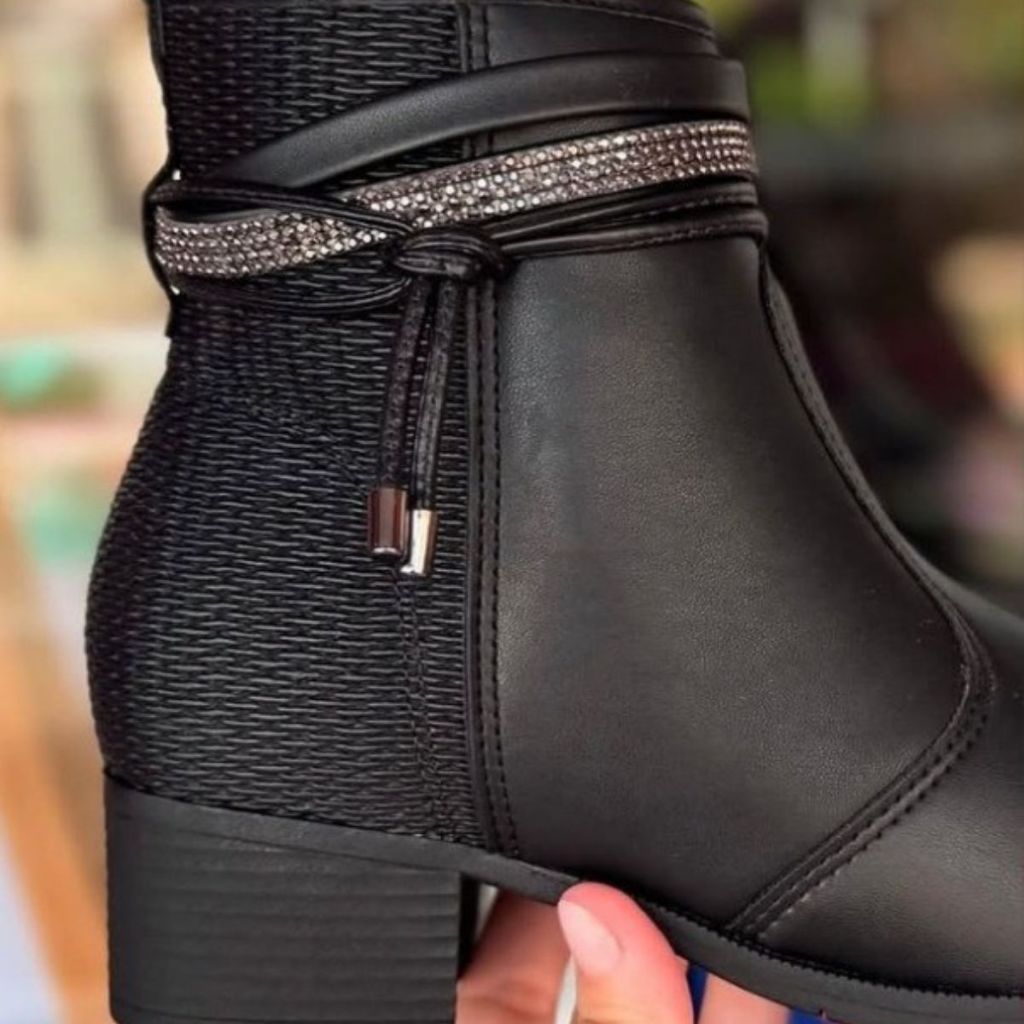 Bota Feminina Moleca Salto Baixo Grosso Cano Curto Tira Strass Detalhe Nó Conforto