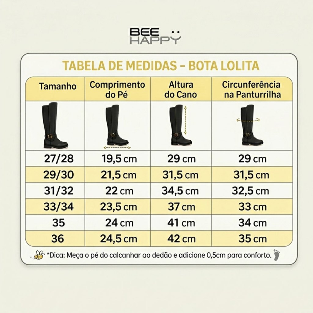 Bota montaria infantil Bee Happy lolita kids cano alto - preto, com tira elástico, fechamento lateral por zíper, super macia e confortável. A linha lolita traz os modelos clássicos que não saem da moda, com criatividade e estilo a combinação do look é perfeita!! Calçado indicado para atividades como hipismo e equitação. Material em pvc injetado, sendo impermeável na parte que envolve o pé. Cabedal: Pvcsolado: Pvcpalmilha: Soft