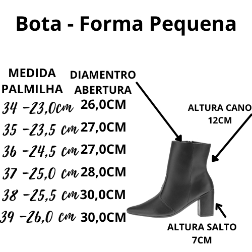 FORMA PEQUENA - COMPRE 1 NUMERO MAIOR QUE CONSTUMA CALÇAR. **Compra realizada até 12h enviamos no mesmo dia.** ****Aconselhamos a compra de 1 numero maior por ser calçado de bico fino. A Allunys Calçados tem o prazer de apresentar a sua mais nova coleção de botas femininas, perfeitas para mulheres modernas e com muito estilo. Com diferentes opções de cores e estilos, a Bota Feminina é a escolha perfeita para mulheres que não abrem mão da elegância e do conforto em seus calçados. Seja para trabalhar ou passear, esta bota é a escolha certa para deixar seu look ainda mais incrível. Cores - Preto / OFF White / Marrom Caramelo Material: Napa ; Detalhe: Zíper ; Altuta Cano: 12cm Palmilha: 8 mm de Espessura, Espuma em EVA, e Taloneira Napa; Forro: Cacharrel, material espumado para maior conforto; Salto: 7,5 cm de Altura encapado na cor do calçado. Solado de PVC . Dimensões da Caixa: 28,5 x 23,5 x 9,5 cm Peso do Produto na Caixa: 800 gramas (aproximadamente) *PROTEÇÃO DO ENVIO – Caixa Individual – Embalada com Envelope Plástico Resistente. *DEVOLUÇÃO GRATÍS e REEMBOLSO *CONSERVAÇÃO, para conservar o seu modelo novo e bonito por muito mais tempo é fundamental seguir algumas recomendações: A limpeza deve ser feita com sabão neutro e pano úmido e não deve ficar de molho. Não usar nenhuma fonte de calor para secar. Guardar em local sem umidade e deixar descansar na sombra por 12 horas após o uso. Não utilize Máquina de lavar e secar. Independente do material do seu sapato, não esfregue com força ou passe esponjas grossas. Caso alguma dessas indicações não forem cumpridas, isso poderá danificar os materiais, a cor e a textura do seu calçado. AS FOTOS DOS PRODUTOS SÃO ORIGINAIS, VOCÊ RECEBERÁ PRODUTO IGUAL O DA FOTO. Tamanho (BR) Comprimento do pé 34 -23,0cm 35 -23,5 cm 36 -24,5 cm 37 -25,0 cm 38 -25,5 cm 39 -26,0 cm Dicas Do Comprador. 1. Dependemos da satisfação do nosso cliente para ter sucesso. Portanto, seu feedback é extremamente importante para nós. 2. Se você estiver satisfeito com nossos itens, deixe-nos um feedback de 5 estrelas, obrigado!!! 3. Entre em contato conosco antes de deixar algum feedback negativo! Trabalharemos com você para resolver quaisquer problemas. Obrigado por ler, aproveite suas compras. A Empresa Allunys Calçados, Desde o ano de 2006 a Allunys Calçados Calçados Femininos atua no mercado para oferecer produtos de qualidade com preços acessíveis e o melhor custo benefício ao cliente. Atuamos com vendas on-line de calçados femininos, e temos como base nossa própria linha de produção no interior de São Paulo. Nosso compromisso, Atender aos clientes com o máximo de confiabilidade, rapidez, preços competitivos e produtos com qualidade. Faça suas compras com 100% de segurança. Agradecemos a preferência!!