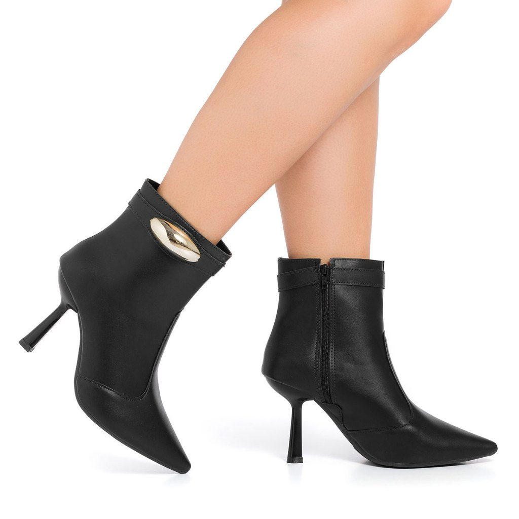 Bota Feminino Stessy Shoes Cano Curto Bico Fino Salto Alto Lesma Metalizada Elegância Chic