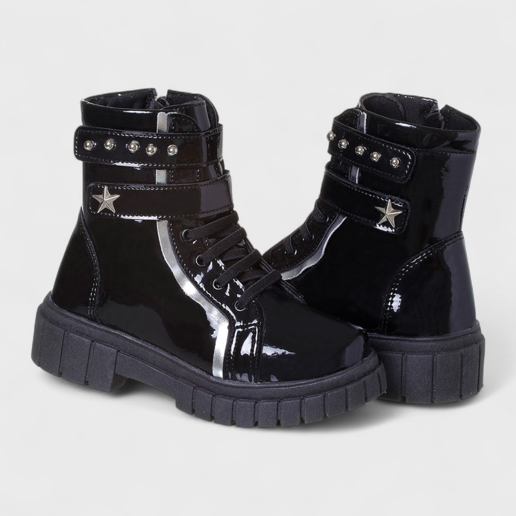 TABELA DE MEDIDAS N° 28 - 18,7 cm N° 29 - 19,5 cm N° 30 - 20,3 cm N° 31 - 21 cm N° 32 - 21,5 cm N° 33 - 22 cm N° 34 - 23 cm Bota infantil moderna e estilosa, confeccionada em material sintético envernizado na cor preta. O modelo apresenta fechamento por elástico e uma tira ajustável com aplicação de tachas metálicas, além de um charmoso detalhe de estrela lateral. Possui solado robusto em borracha antiderrapante, garantindo conforto e segurança para os pequenos. Ideal para compor looks despojados e cheios de atitude. Disponível na numeração do 28 ao 34.
