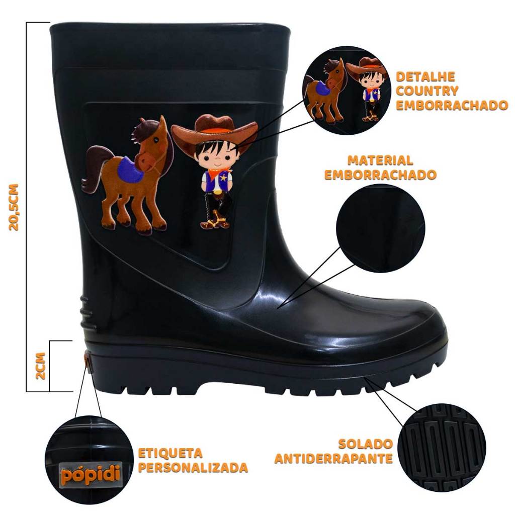 Galocha Infantil segue sendo tendência. É a escolha perfeita tanto para dias chuvosos, quanto dias ensolarados, reunindo o estilo e a praticidade em um só produto. DESCRIÇÃO Produto Injetado em PVC, extremamente confortável e palmilha em EVA dublada. Possui solado antiderrapante, dando maior segurança e aderência ao andar. DETALHES DO PRODUTO Material Externo: Injetado PVC Material Interno: Injetado PVC Material da Palmilha: EVA dublado Material da Sola: Injetado PVC Fechamento: Calce Fácil Embalagem: Não é entregue em caixa individual Nós da Pópidi cuidamos com carinho da relação pré e pós-venda, afinal a satisfação de nossos clientes é muito importante para nós! Atendimento: Segunda à sexta: 07:00 às 18:00 Sábado: 09:00 às 13:00 TABELA DE MEDIDAS Número --- Medida ----- Cano ----- Circunferência 25/26 ----- 16,8cm ------ 17,0cm ------ 26,5cm 27/28 ----- 18,0cm ------ 17,5cm ------ 28,5cm 29/30 ----- 19,4cm ------ 18,0cm ------ 30,0cm 31/32 ----- 21,0cm ------ 19,0cm ------ 32,0cm 33/34 ----- 22,3cm ------ 20,0cm ------ 34,0cm COMO MEDIR Coloque o pé em cima de uma folha de papel e risque em volta dele com um lápis ou caneta. Meça o comprimento do topo até a base do contorno e adicione 0,5 cm de folga. LIMPEZA E CONSERVAÇÃO Evite usar substâncias abrasivas como álcool, detergentes ou solventes nos calçados. Nunca os mergulhe na água, os deixe de molho ou lave na maquina. A secagem dos produtos deve ser feita à temperatura ambiente e na sombra, nunca no sol ou em maquinas. SOBRE A EMPRESA Visão Estar em constante expansão e inovação, de uma forma consistente e arrojada. Missão Proporcionar o bem estar dos nossos clientes, satisfazendo-os em um ambiente agradável e cortês com produtos a preços justos e de qualidade. Valores Respeito, Dedicação, Conexão e Atitude. Boas compras e volte sempre!!!