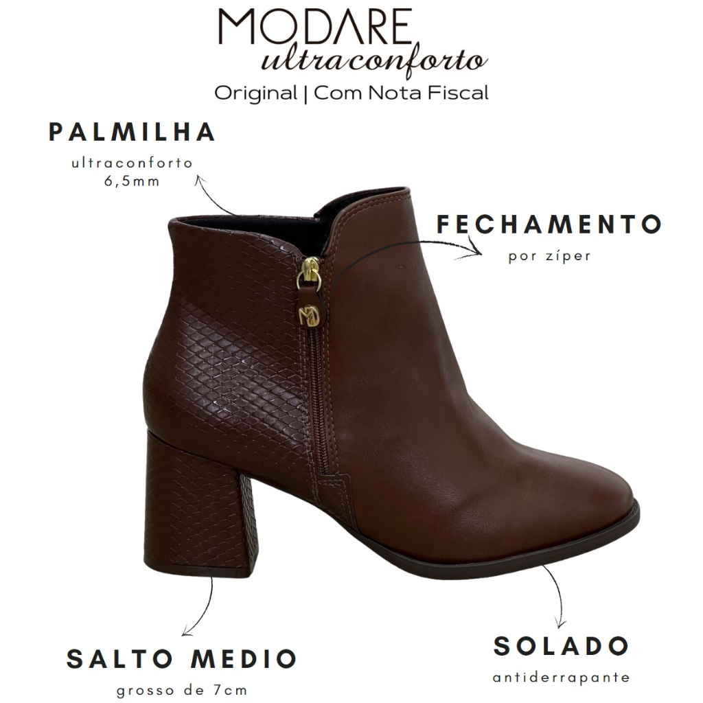 A Bota Modare vem com uma dose extra de beleza e bem estar. Antenada nas tendencias e tecnologias do momento a Modare traz esse lindo modelo de bota com o objetivo de deixar a vida das mulheres modernas cheias de praticidade e elegância. Confeccionada em material sintético de alta qualidade, o modelo é liso e conta com o design super moderno na parte traseira e no salto do material com textura em cobra, que adiciona um toque de elegância e sofisticação no visual. O modelo conta com zíper na lateral facilitando o calce. Sua palmilha ultramacia de 6,5mm que acomoda o pé de forma anatômica. Seu salto possui 7cm de altura Seu solado é antiderrapante que promovem muito mais segurança e estabilidade ao caminhar. CARACTERÍSTICAS GERAIS Forma: Normal Cabedal: Sintético Fechamento: Zíper Palmilha: Ultraconforto 6,5mm de espuma Solado: Antiderrapante Salto: Médio 7cm Tipo do Salto: Grosso Envio: Caixa do fabricante TABELA DE MEDIDAS Tamanho 34 - 24cm Tamanho 35 - 24,5cm Tamanho 36 - 25cm Tamanho 37 - 25,5cm Tamanho 38 - 26cm Tamanho 39 - 27cm Tamanho 40 - 28cm