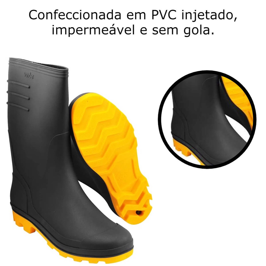 Possui resistência ao escorregamento em piso de cerâmica contaminado com lauril sulfato de sódio (detergente) e piso de aço contaminado com glicerol (SRC). Confeccionada em PVC injetado, impermeável e sem gola. Indicada para proteção dos pés do usuário contra riscos de natureza leve, contra agentes abrasivos e escoriantes, e contra umidade proveniente de operações com uso de água. Utilizada na construção civil, postos de gasolina, lojas de motopeças, agroindústrias, atividades agrícolas, pesca, entre outros. Características: - Marca: Vonder - Modelo: 7075 *Imagens Meramente Ilustrativas Especificações Técnicas: - Número do certificado de aprovação - CA:43107 - Cor:Preta e amarela - Material do calçado:PVC - Acabamento interno do calçado:Sem forro - Tamanho do cano do calçado:Cano médio - Tipo de solado do calçado:PVC - Tipo de biqueira:Sem biqueira - Palmilha:Sem - Observação:Não utilizar para combate a incêndio Conteúdo da Embalagem: - 1 Par de Botas de PVC