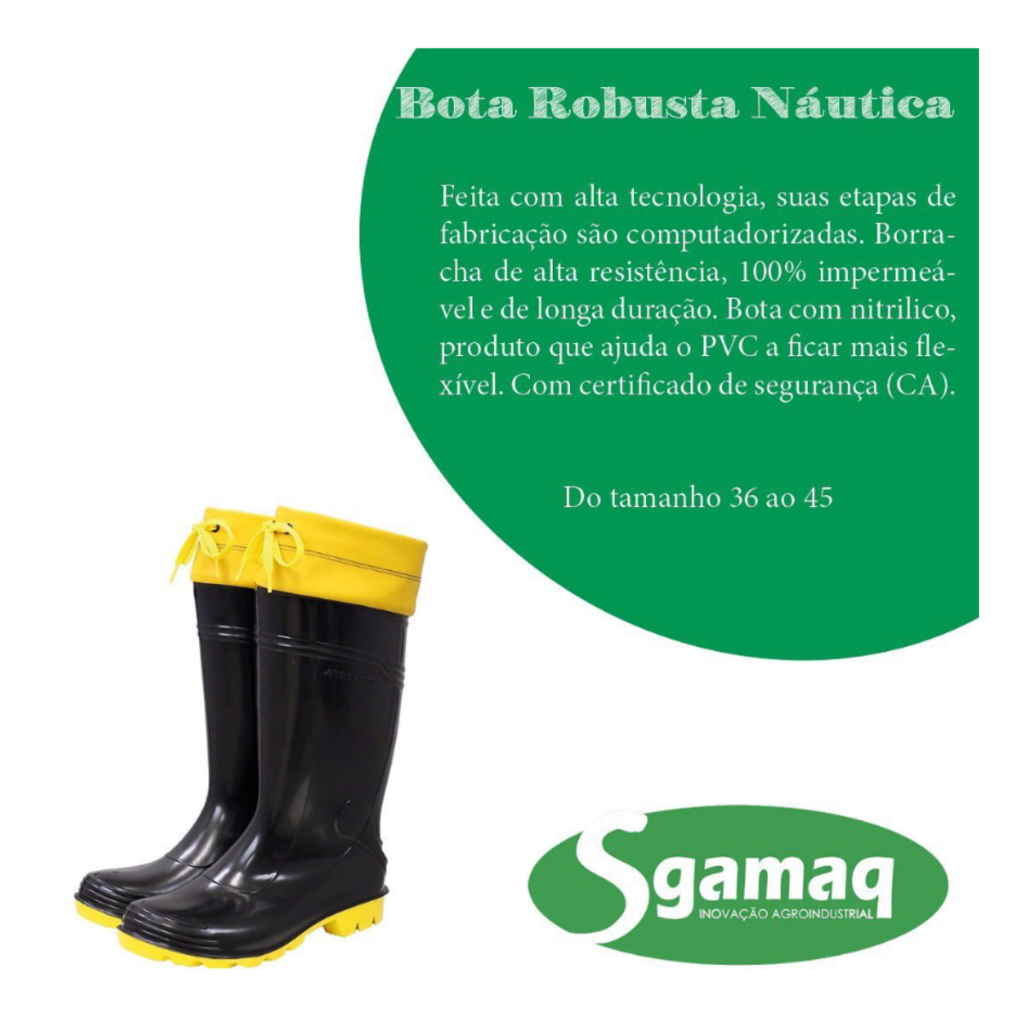 ATENÇÃO!! Não enviamos para os Estados de Tocantins e do Maranhão Calçado ocupacioanal, impermeável, tipo bota abaixo do joelho, Confeccionada em pvc. Feita com alta teconologia, a bota náutica preta com solado amarelo é 100% impermeável e possui nitrílico, o que ajuda a ficar mais flexível.