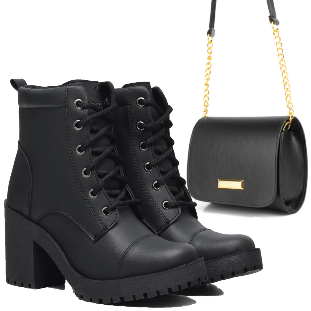 BOTA + BOLSA Bota feminina de cano médio com salto grosso e solado tratorado. Confeccionada em material sintético, com fechamento por cadarço para melhor ajuste. Ideal para compor looks estilosos e confortáveis no dia a dia ou em ocasiões casuais. Moderna, resistente e versátil! SALTO: 9CM MEDIDA DAS PALMILHAS: 33- 23,5 CM 34- 24,0 CM 35- 25,0 CM 36- 25,5 CM 37- 26,0 CM 38- 26,5 CM 39- 27,0 CM 40- 27,5 CM (Se medir sua palmilha com uma régua, considerar desde o numero 0 (zero))