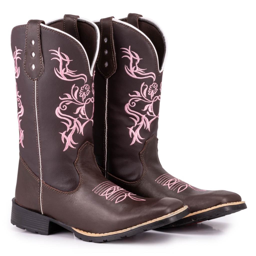 Bota Texana Feminina Country Bico Quadrado solado De Borracha Bordado Tribal Rosa